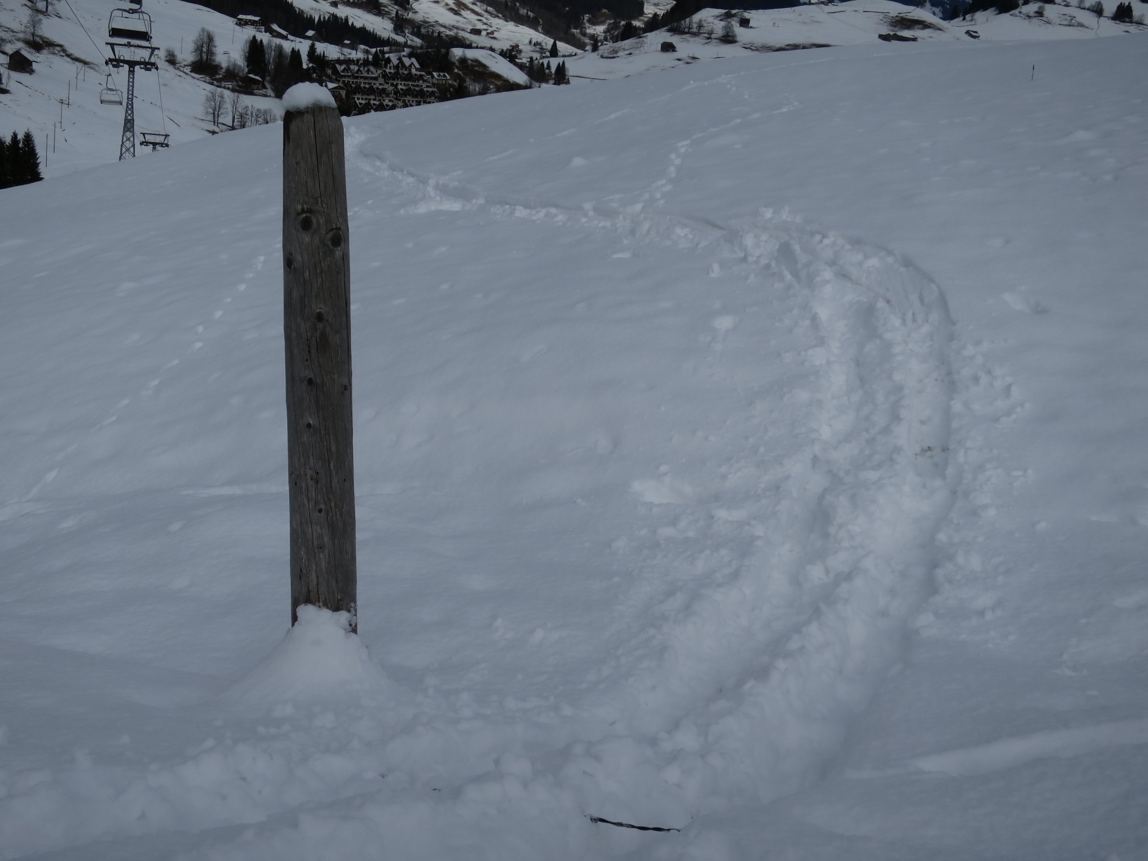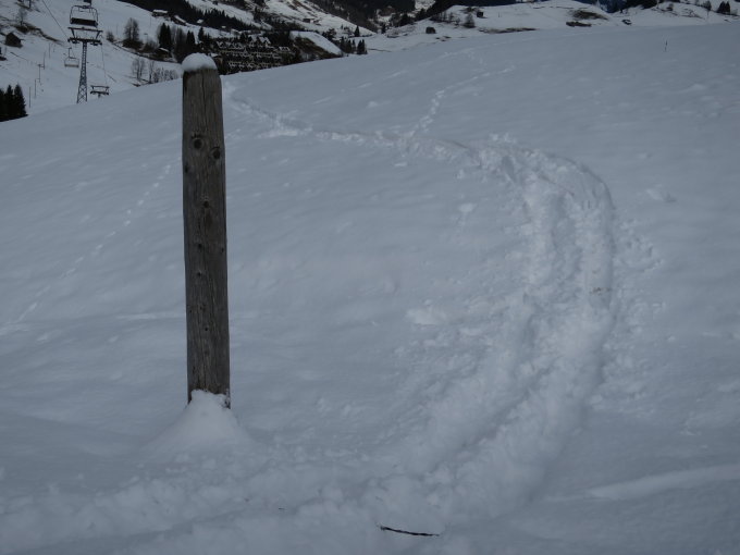 2.Abfahrt durchs Ybriggebiet gut, die letzten Böden oberhalb Tschalun haben zum Glück nicht soviel Steine im Untergrund versteckt, da die Schneeauflage dort doch sehr dünn (10cm) u nichtttragende wird;