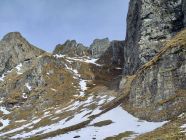 Auf ca. 2080m beginnt in einer exponierten Querung ein grösseres Schneefeld. Dort bin ich umgekehrt. 10 Minuten später hat sich weiter oben eine Lawine gelöst, die einen Haufen Steine über die Querung nach unten geschleudert hat. Zum Glück stand ich weit genug davon entfernt. Drei weitere Gipfelaspiranten sind dann offenbar auch umgekehrt. Drei andere sind erfolgreich bis zum Gipfel gegangen.
