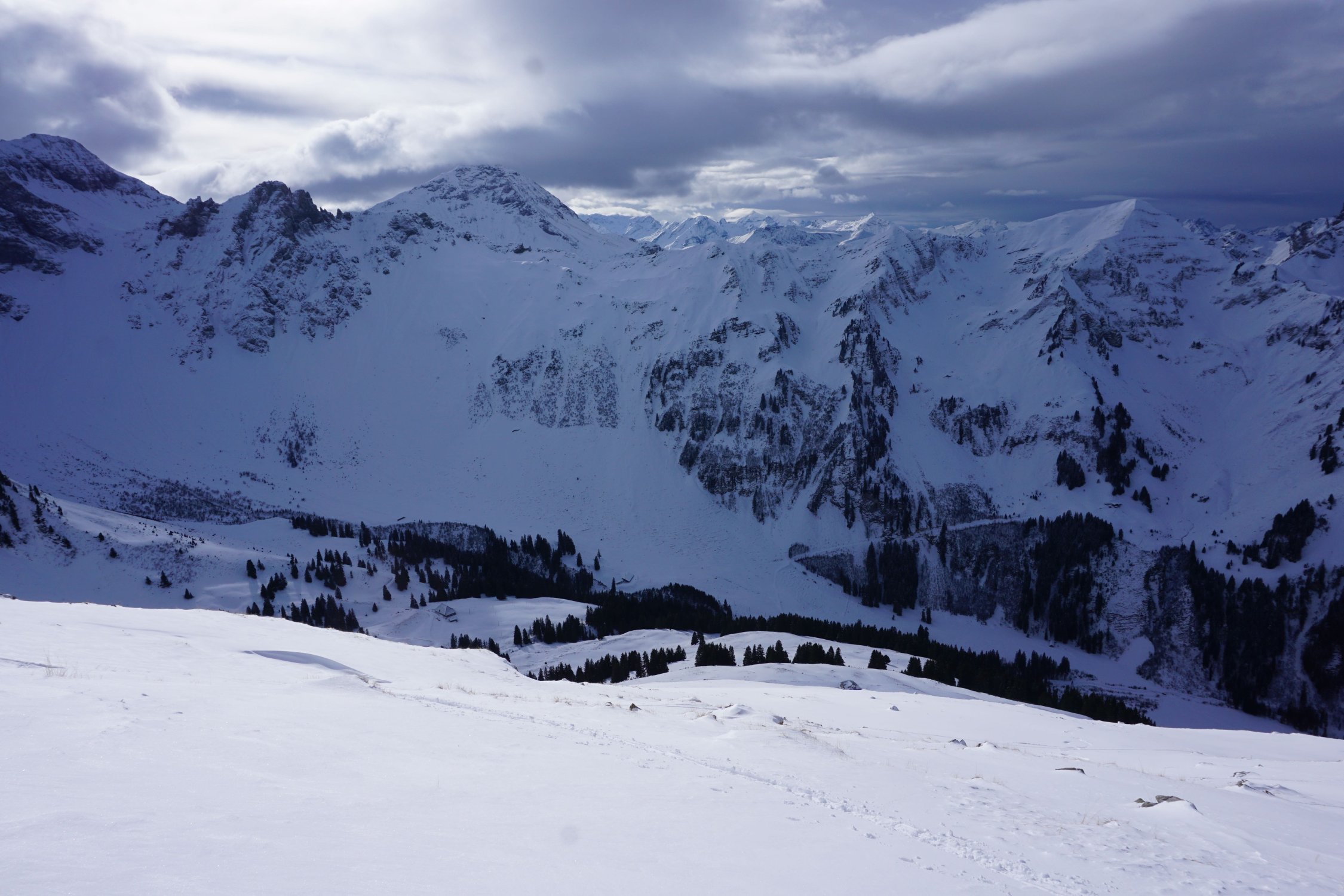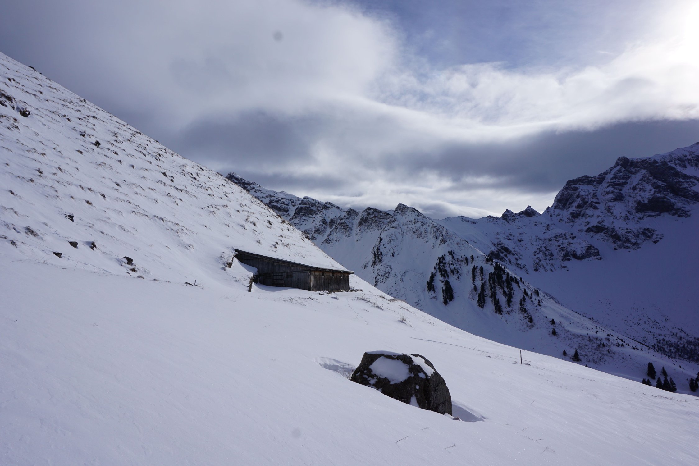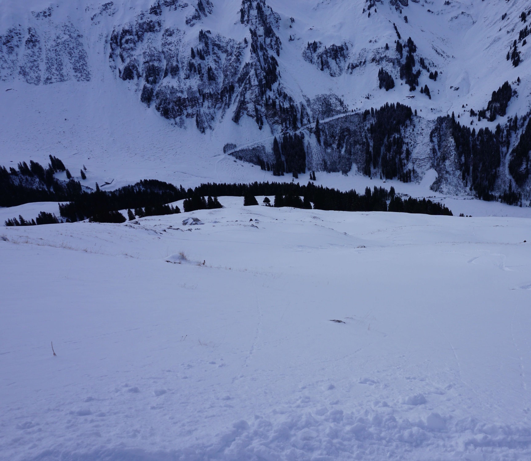 Erstaunlich, dass in den Rinnen und Mulden W genügende Schnee liegt, dass fast ohne Steinkontakt eine Abfahrt möglich ist. Pulverschnee auf einer zum Teil sehr kleinen Altschneeunterlage. Zwischen Mittelberg und Hütte 1825 der Alpstrasse folgen.