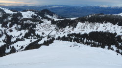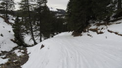 Bis 1700m Nassschnee darüber leichte Pulverauflage, aber vom Wind stark bearbeitet.