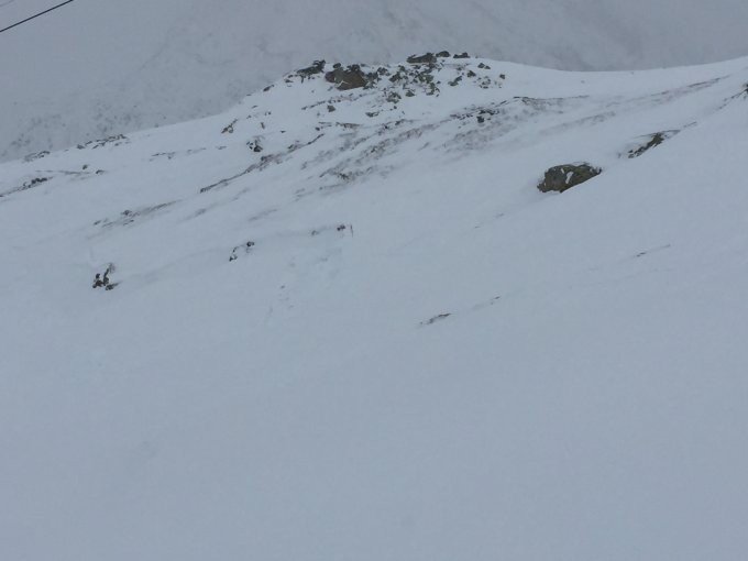 Ab 2200m Risse in der Schneedecke beobachtet und ein spontanes/fernausgelöstes Schneebrett beobachtet das mit einem lauten Wummgeräusch ca. 1m abrutschte auf ca. 40-50m Breite. Der kleine NW Exp. Hang war nicht steiler als 30°.