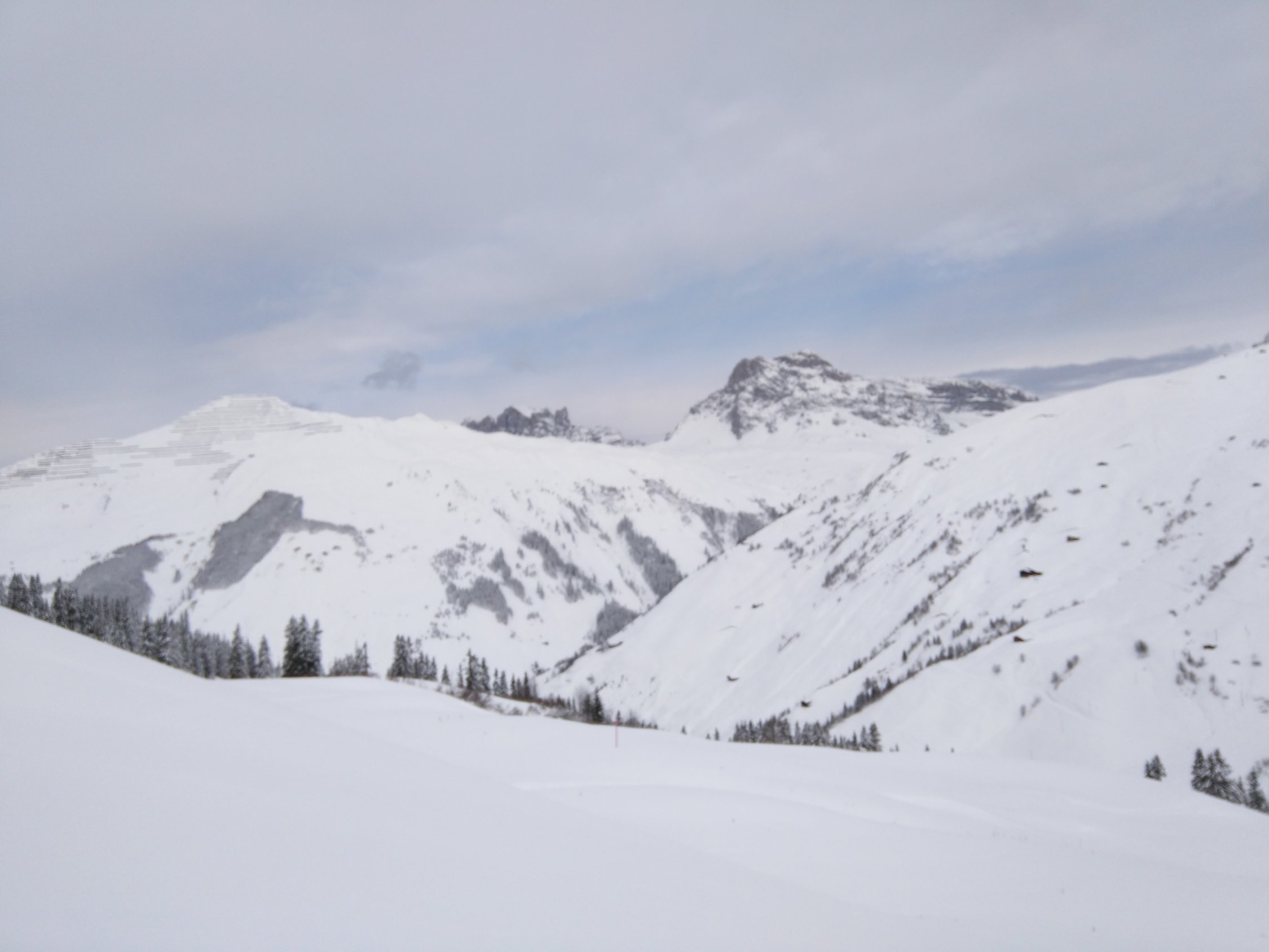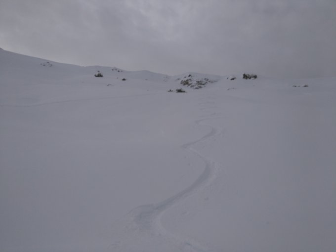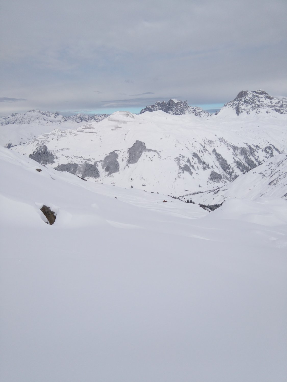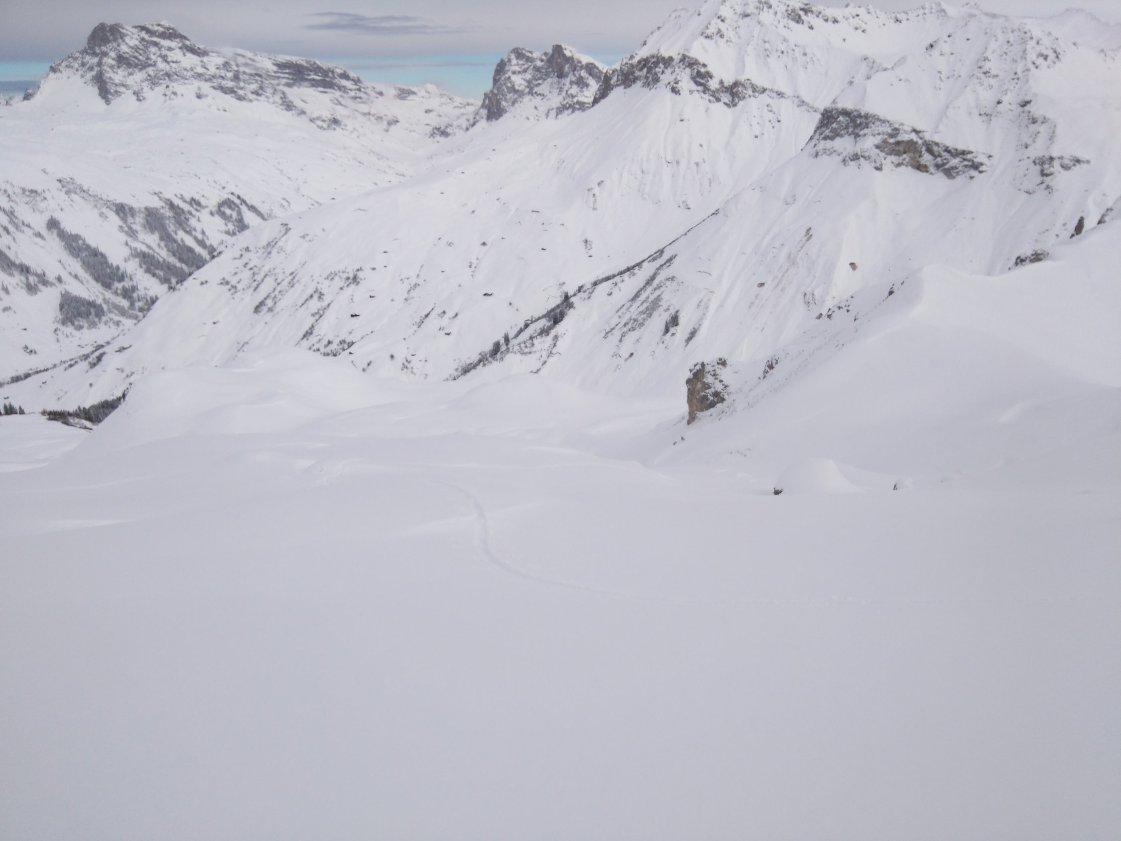 Herrlicher Powder in Hülle und Fülle. Fast zuviel.... Morgen früh noch ziemlich Frisch aber dafür kaum Wind. Einzig auf den Graten dann ein bisschen Wind. Das Wetter war trocken jedoch recht diffuses Licht, welches zeitweise etwas auflockerte und so schöne Abfahrtsmomente zuliess. Auf den hohen Gipfel waren aber rechte Windfahnen sichtbar !