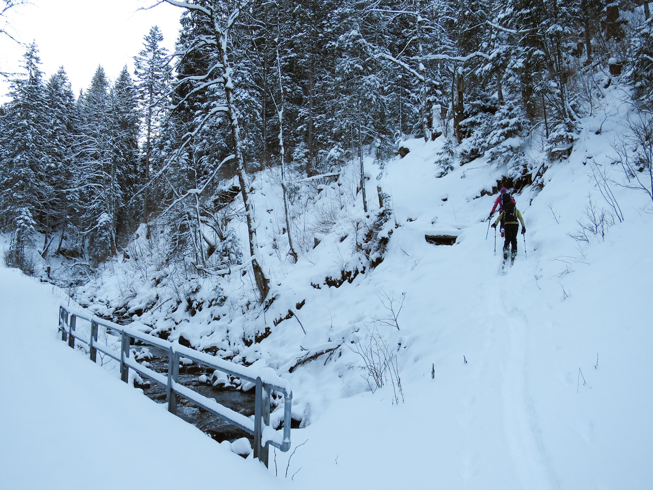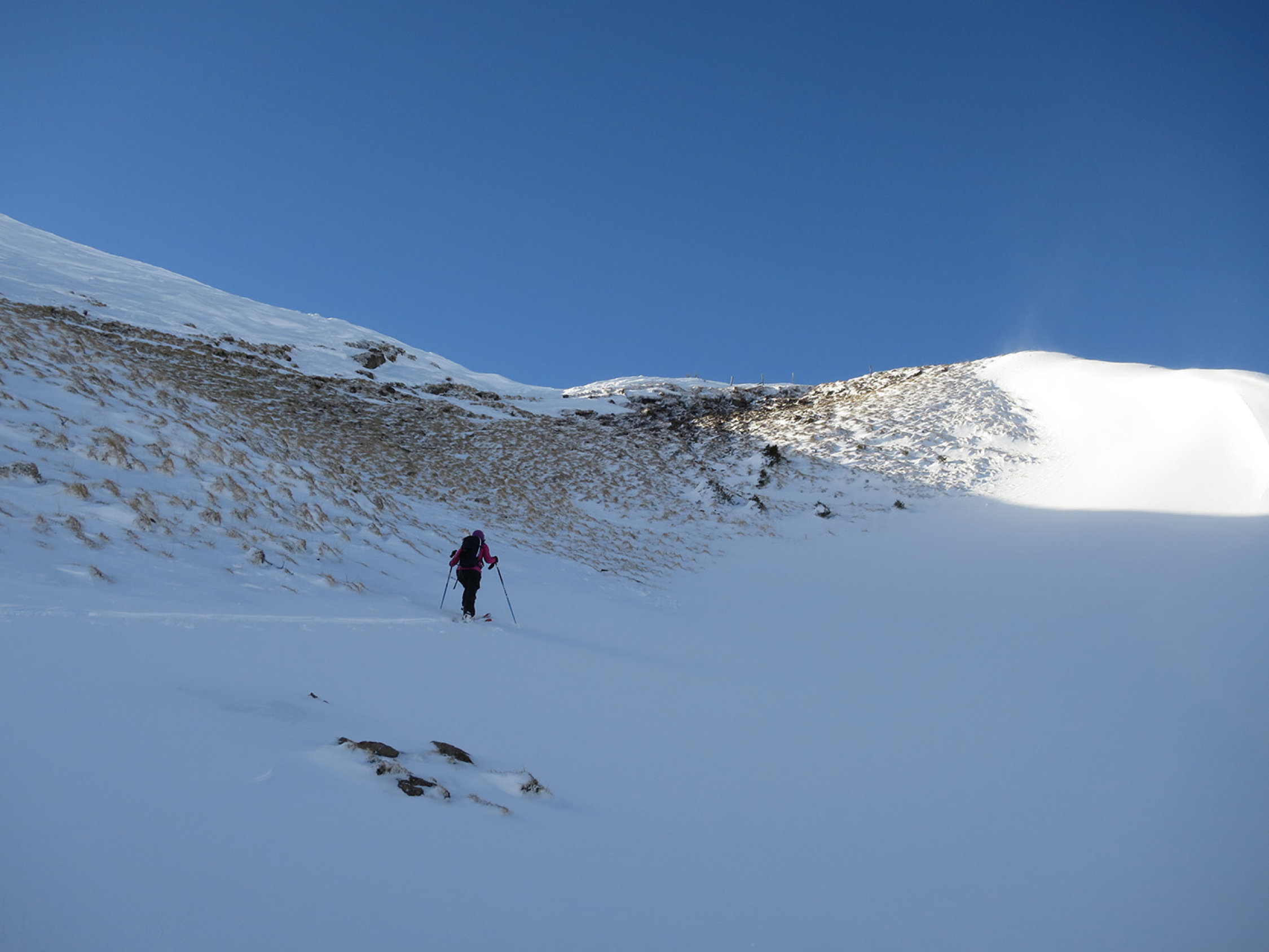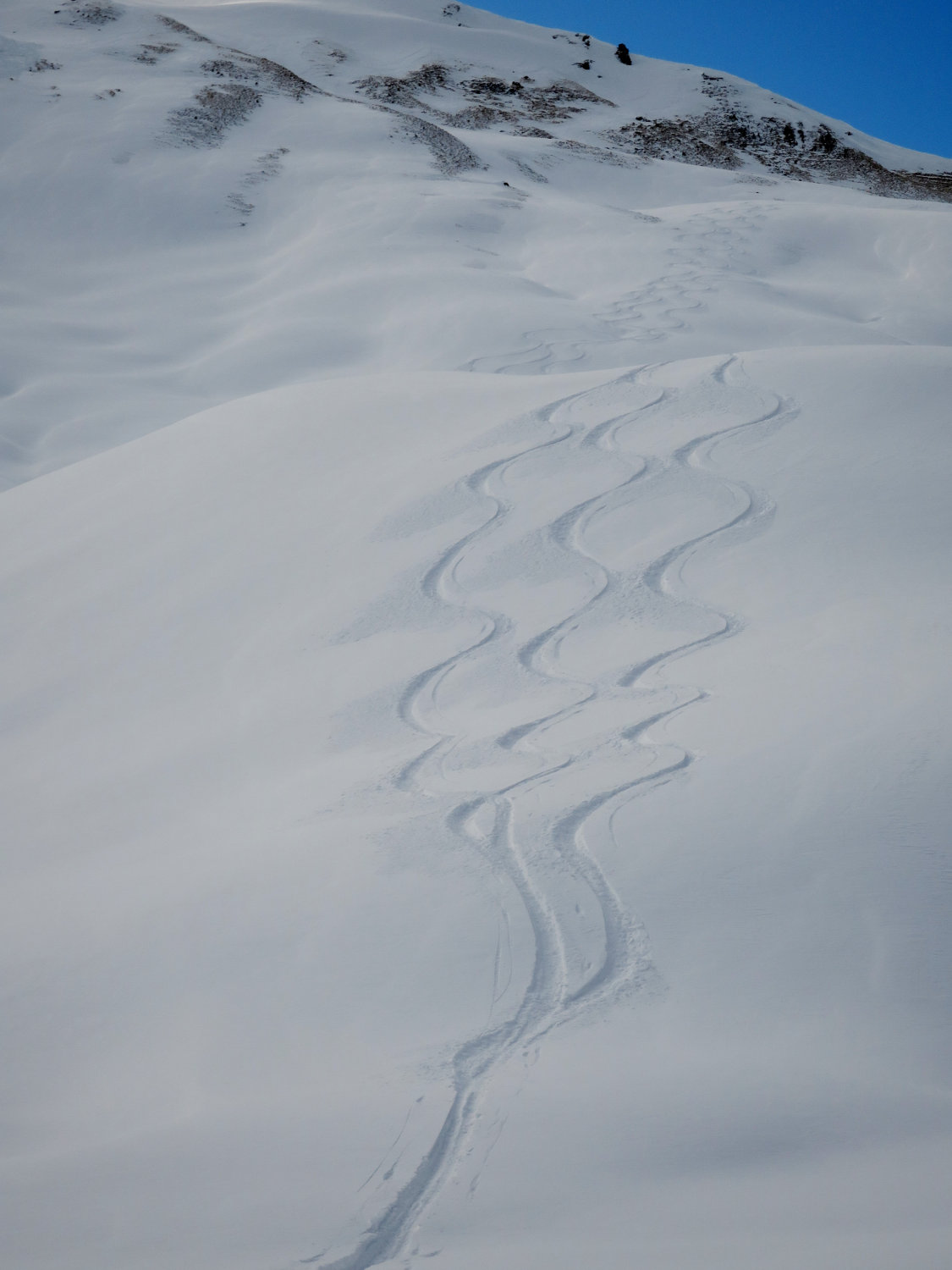 Bis ca. 1350m liegt 15-20cm Neuschnee auf einem dünnen (oder keinem) Untergrund. Höher liegt mehr als genug Schnee, ausser auf dem Grat: dort ist alles weggeblasen worden. Wir haben ein Skidepot ca. 50m vor dem Grat gemacht. Der Schnee ist überall leicht und pulverig und die Abfahrt war sensationell.