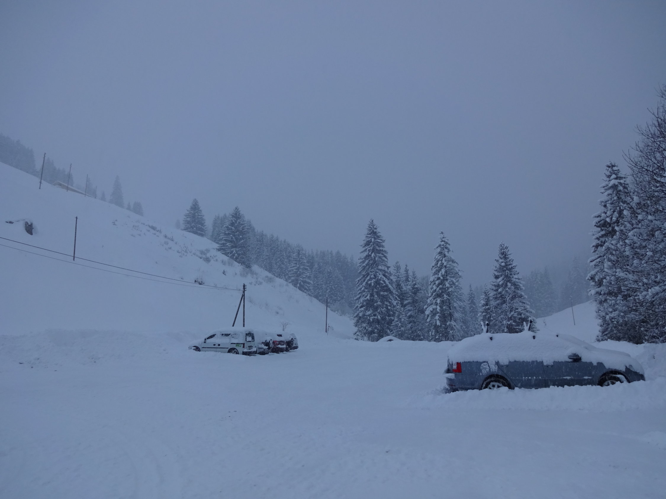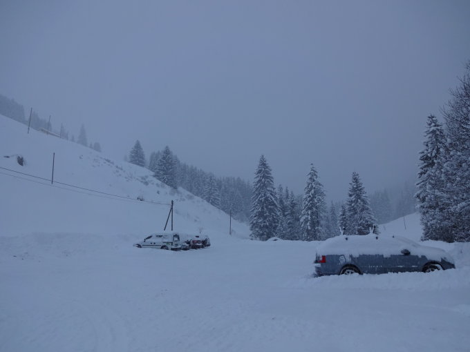 Start um 08.00 Uhr auf dem Parkplatz bei -5C und Schneefall.