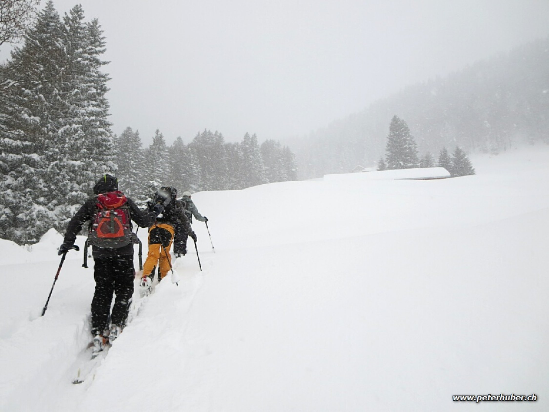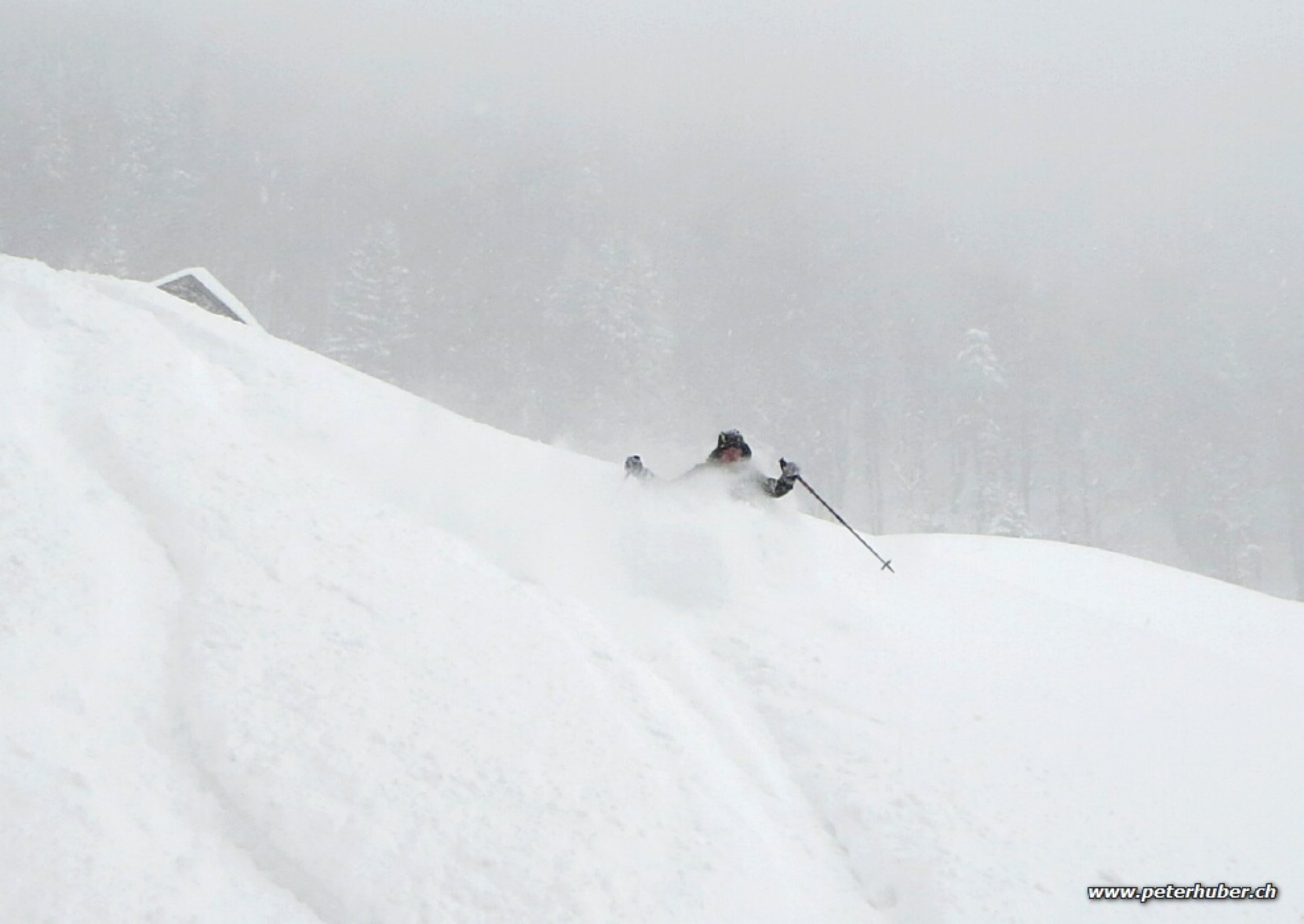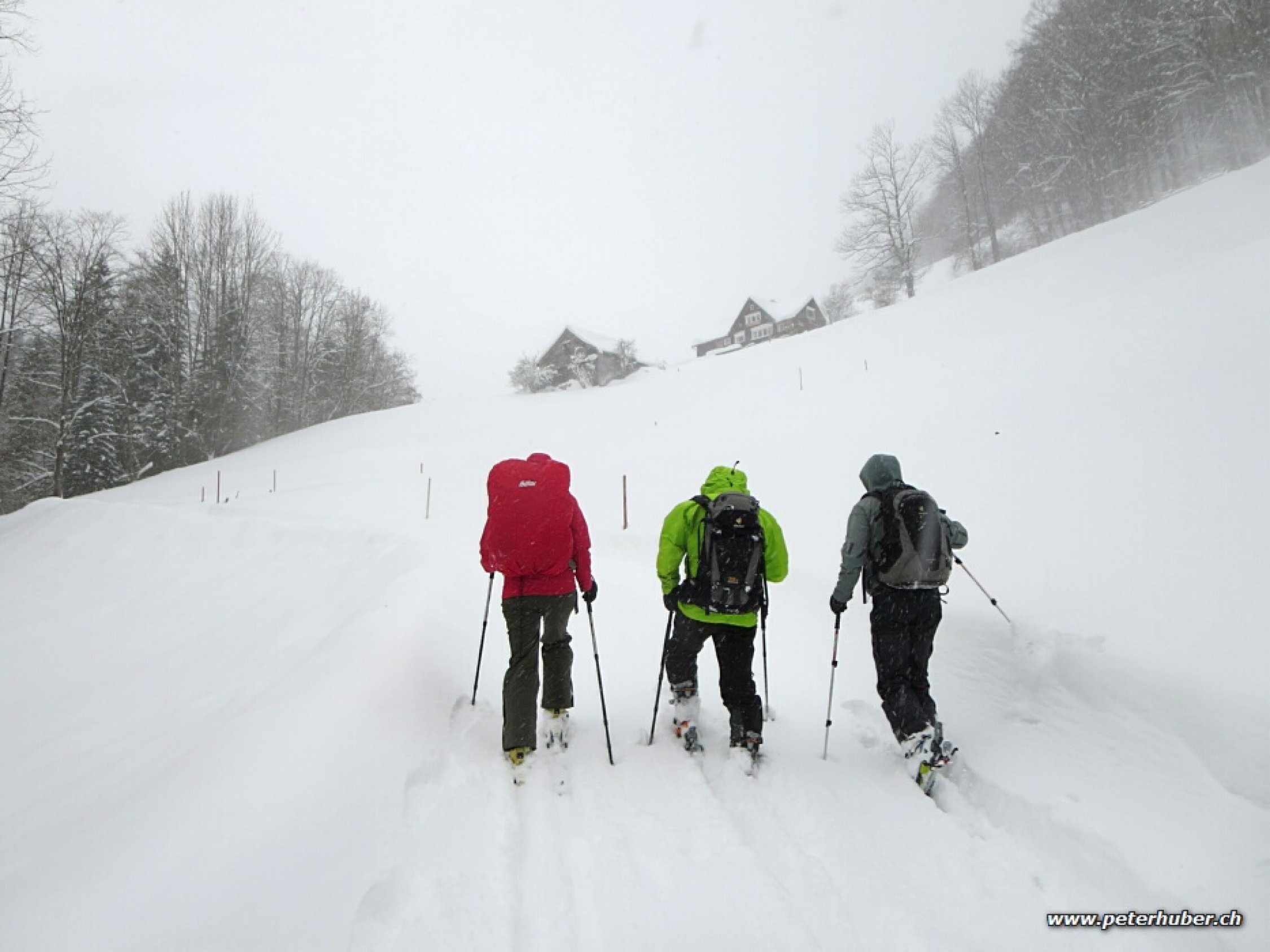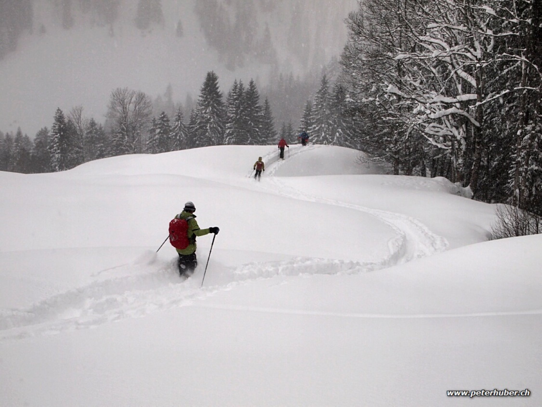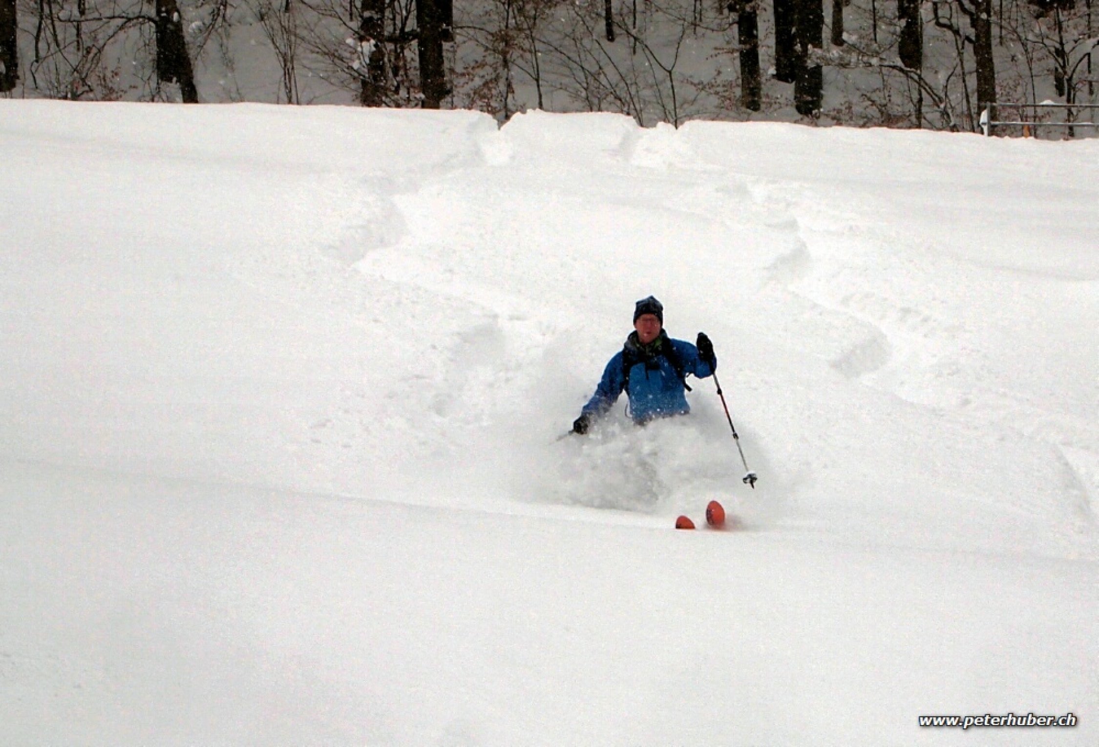 Umkehr wegen des vielen Schnees und den oft mühsamen Abfahrtsverhältnissen. Selbst in mittelsteilen Hängen konnten nur wenige Schwünge gedreht werden bevor man wieder stecken blieb - knietiefer Pulver. Dann wieder Abfahrt entlang der Aufstiegsspur und der Strasse via Langenegg zurück.