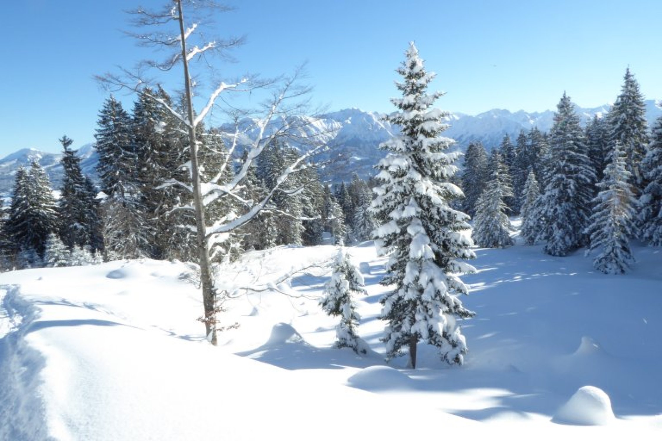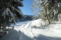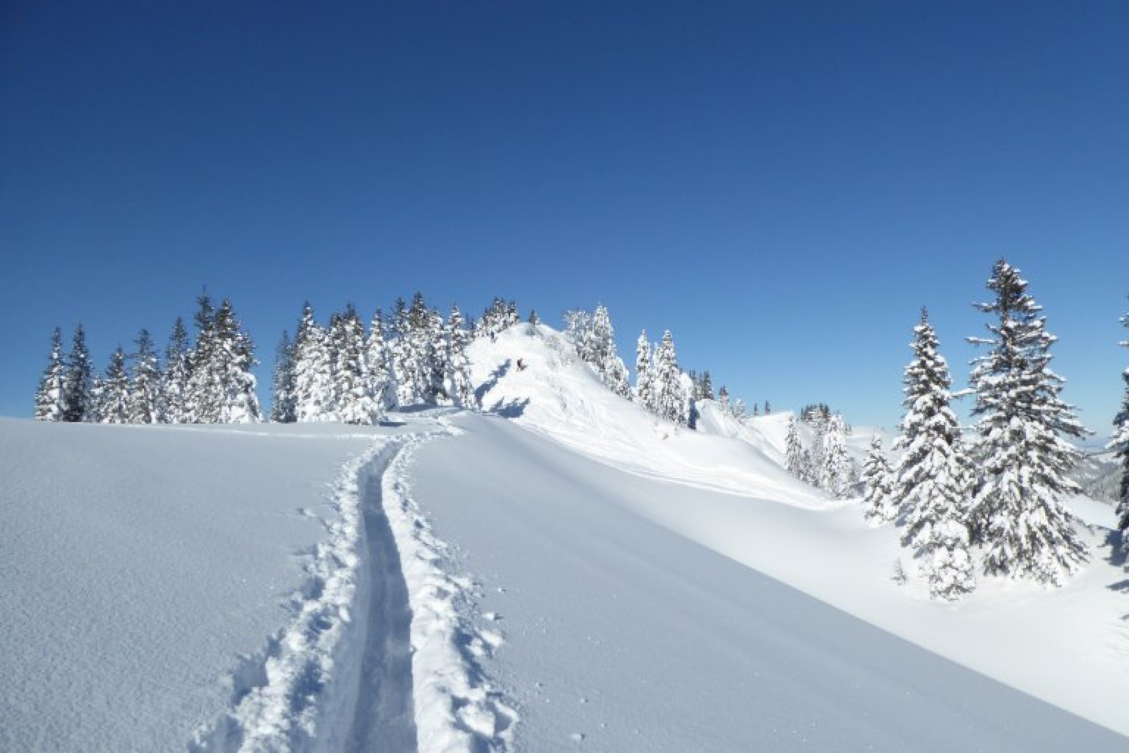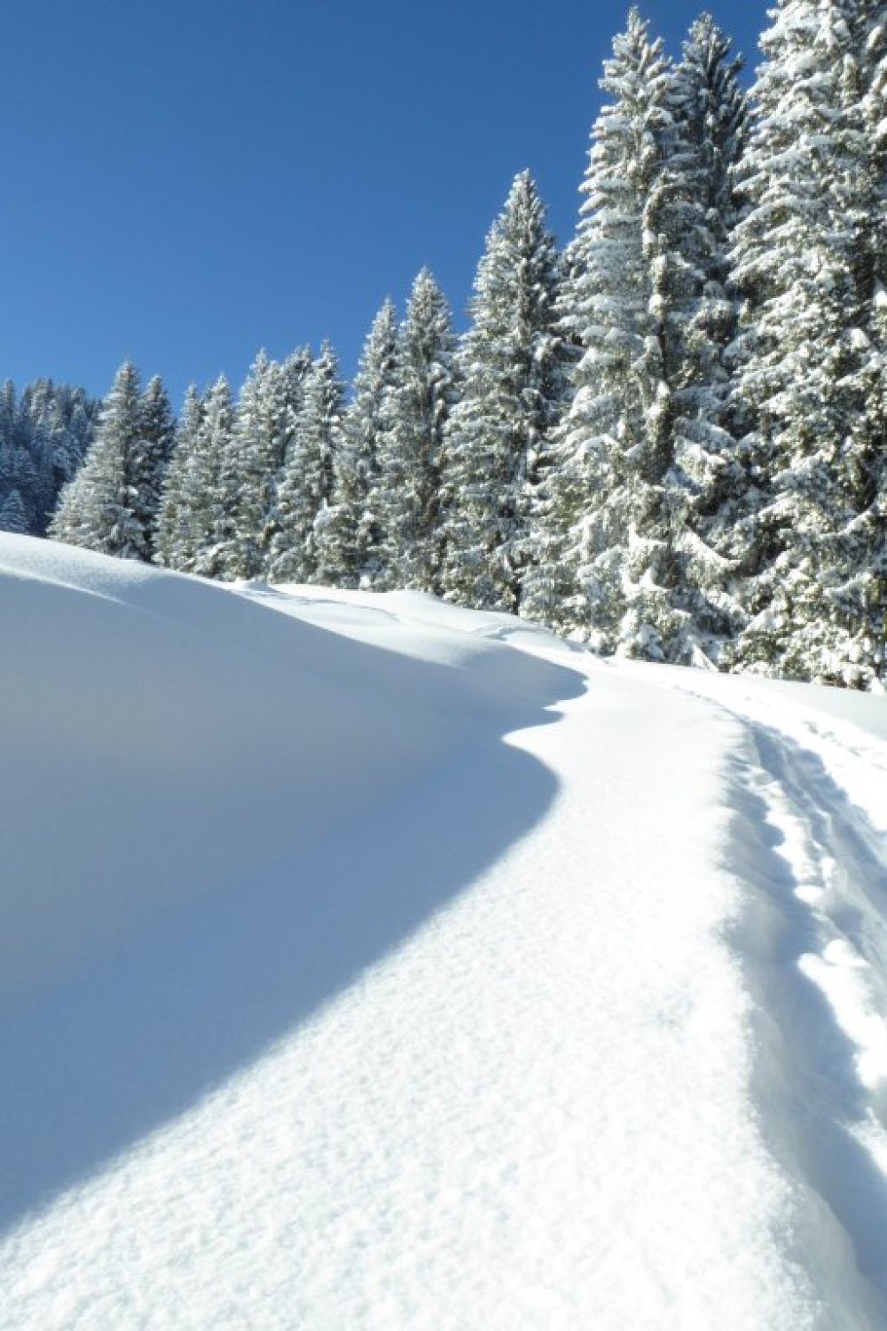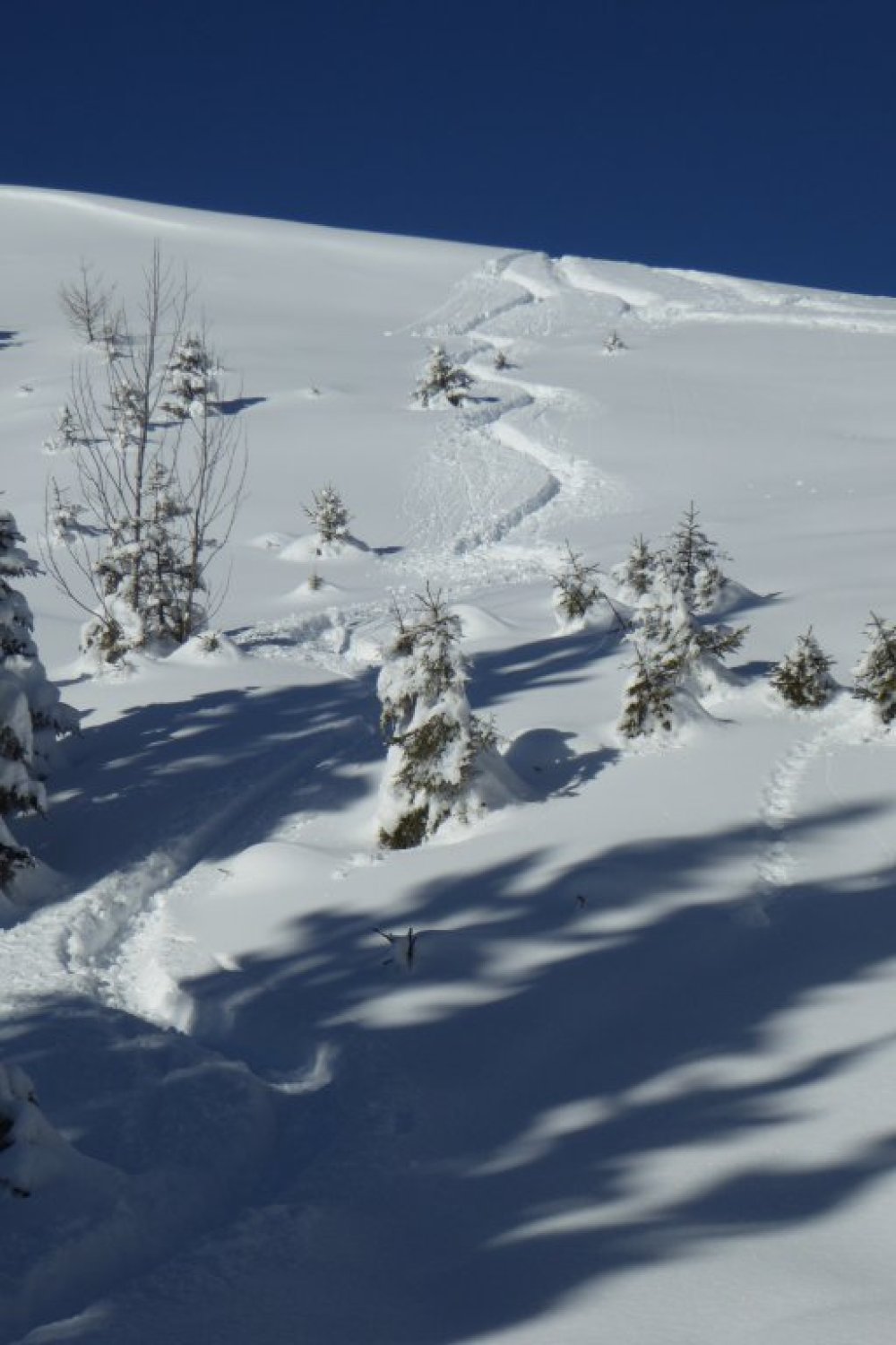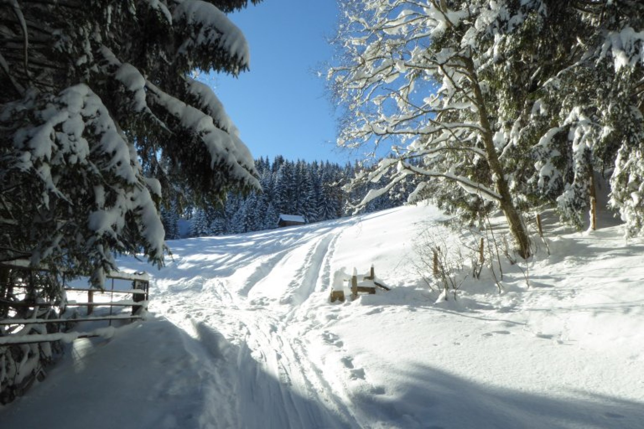 Alles noch locker, aber in den flacheren Zonen sind die freien Flächen nicht der Brüller. Dort sollte man im Bereich der vorhandenen Spuren bleiben um vorwärts zu kommen. Unterer Forstweg bestens eingeschneit und bis zum Auto fahrbar.