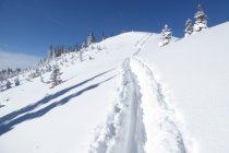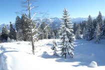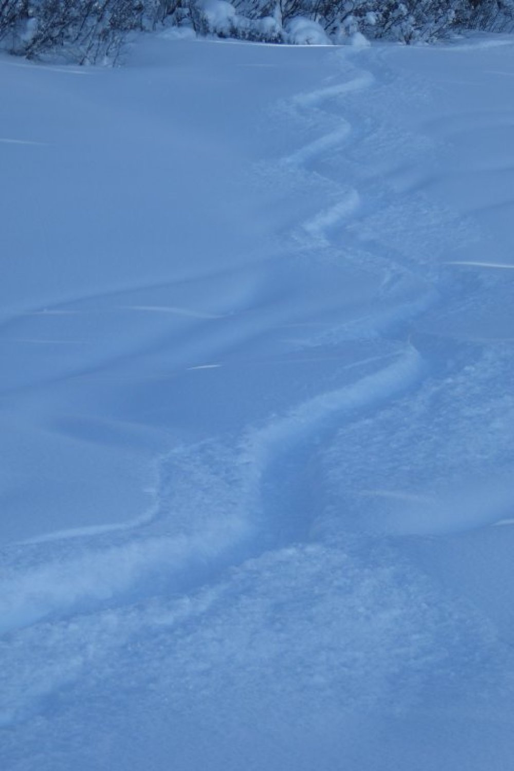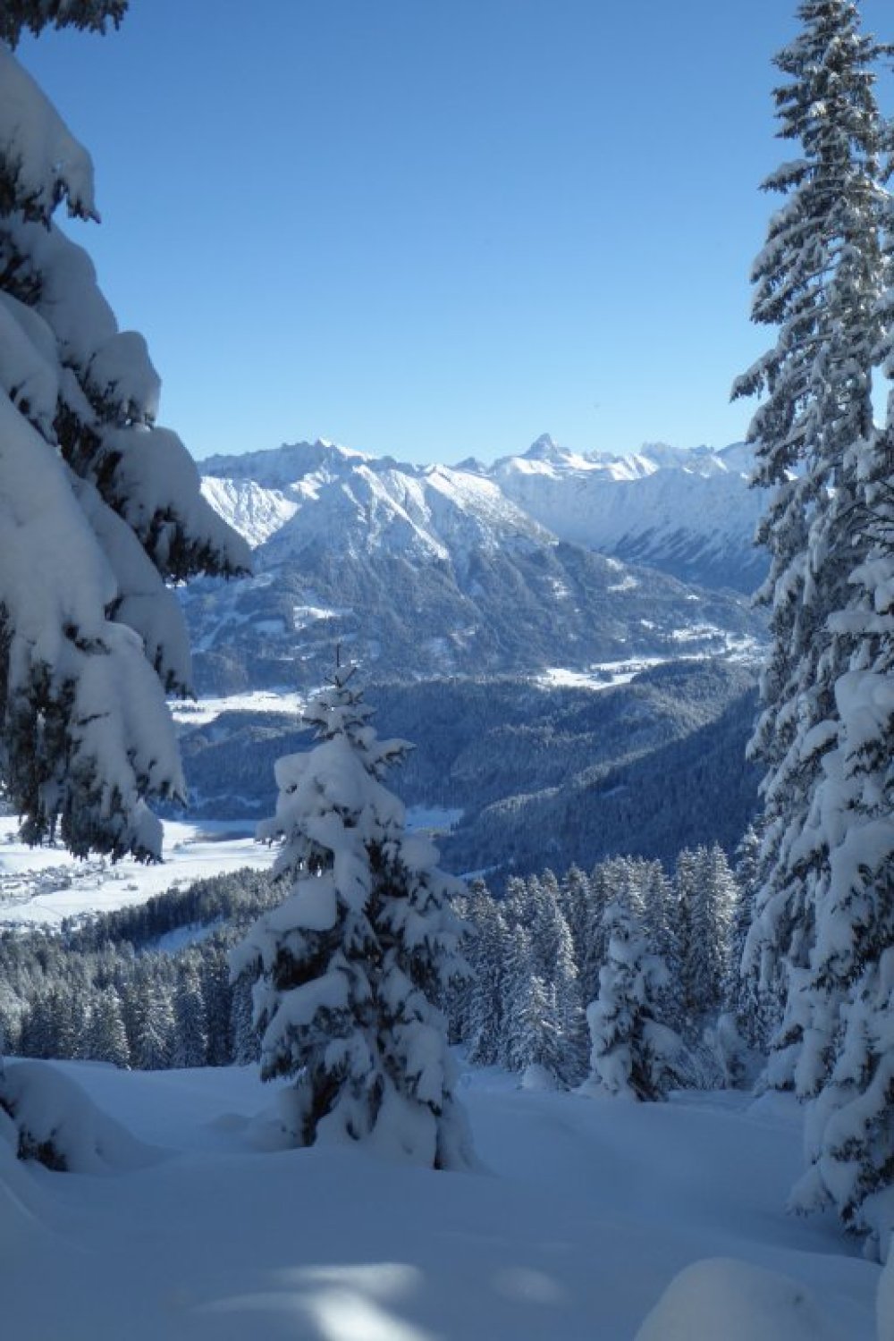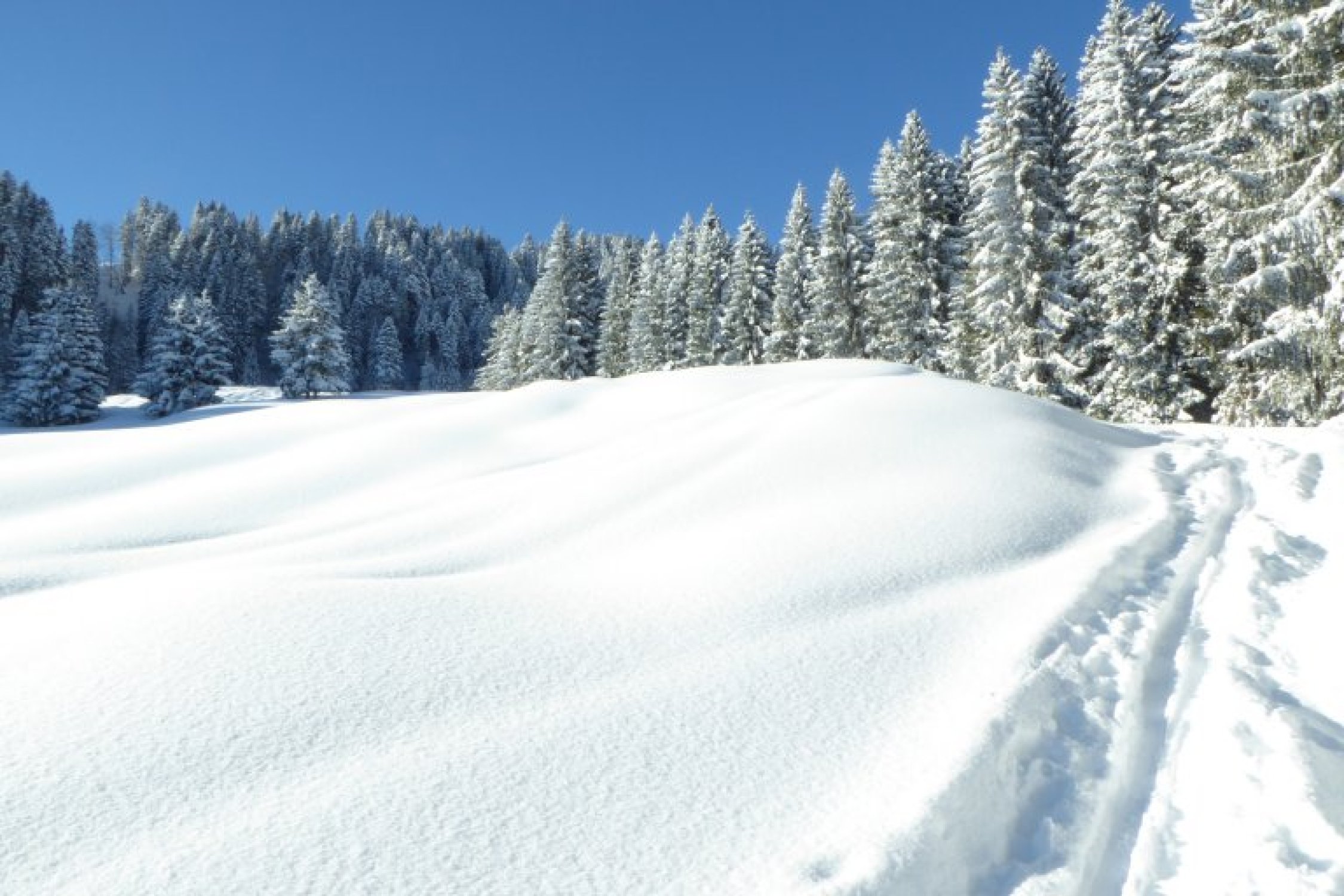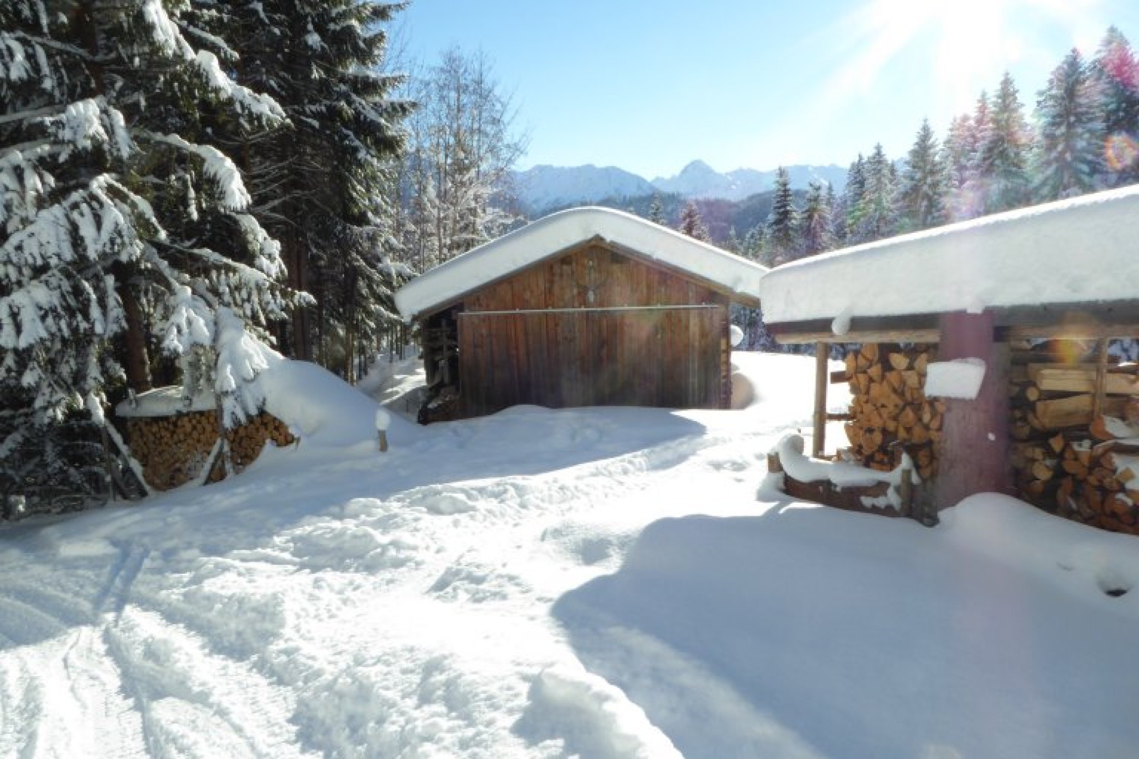 Alles noch locker, aber in den flacheren Zonen sind die freien Flächen nicht der Brüller. Dort sollte man im Bereich der vorhandenen Spuren bleiben um vorwärts zu kommen. Unterer Forstweg bestens eingeschneit und bis zum Auto fahrbar.