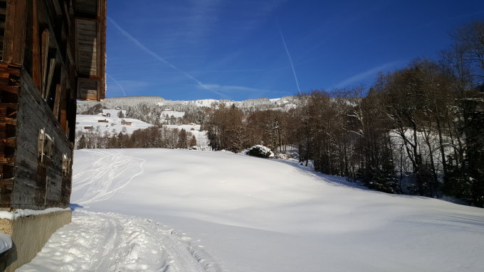 Traumverhältnisse, unten -12° am Morgen, 40 cm Pulver ohne Unterlage, was aber keine Rolle spielt weil auf Wiese. Oben fast windstill und 70 cm Pulver ohne Unterlage. Sonnenschein mit leichten Cirrusschleiern, ein Prachtstag. Abfahrt ohne Grundkontakte auf bestem Pulver. Ab Mittag zog der Hochnebel vom Mittelland her über den Lauerzersee mit Obergrenze auf ca. 900 m, die Sicht war aber immer noch gut, weil die Sonne durchdrückte.