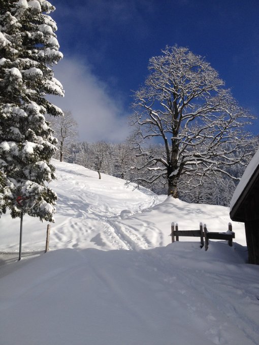 Schnee: genügende Menge bis ins Tal, obere Hälfte feiner Pulver, unten feuchte Pappe.