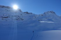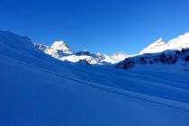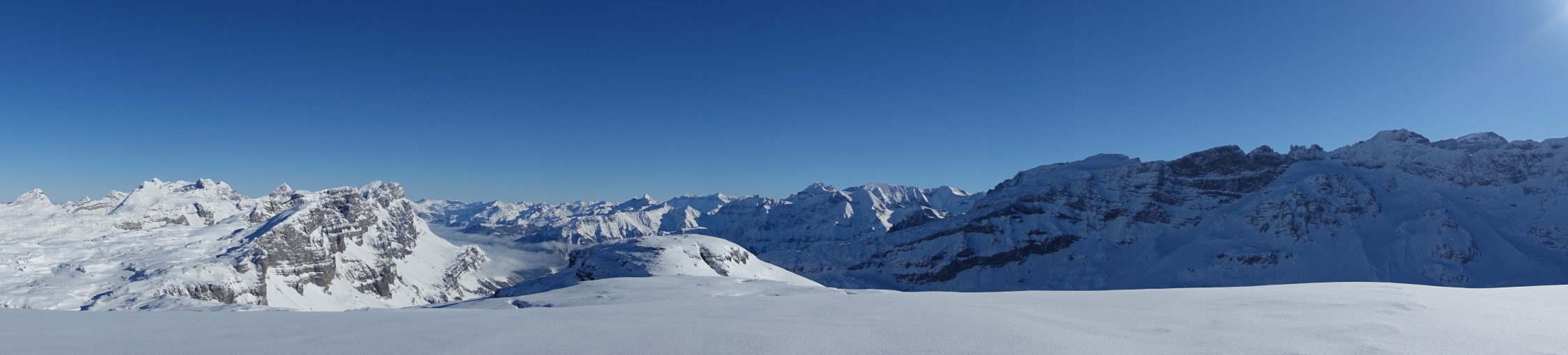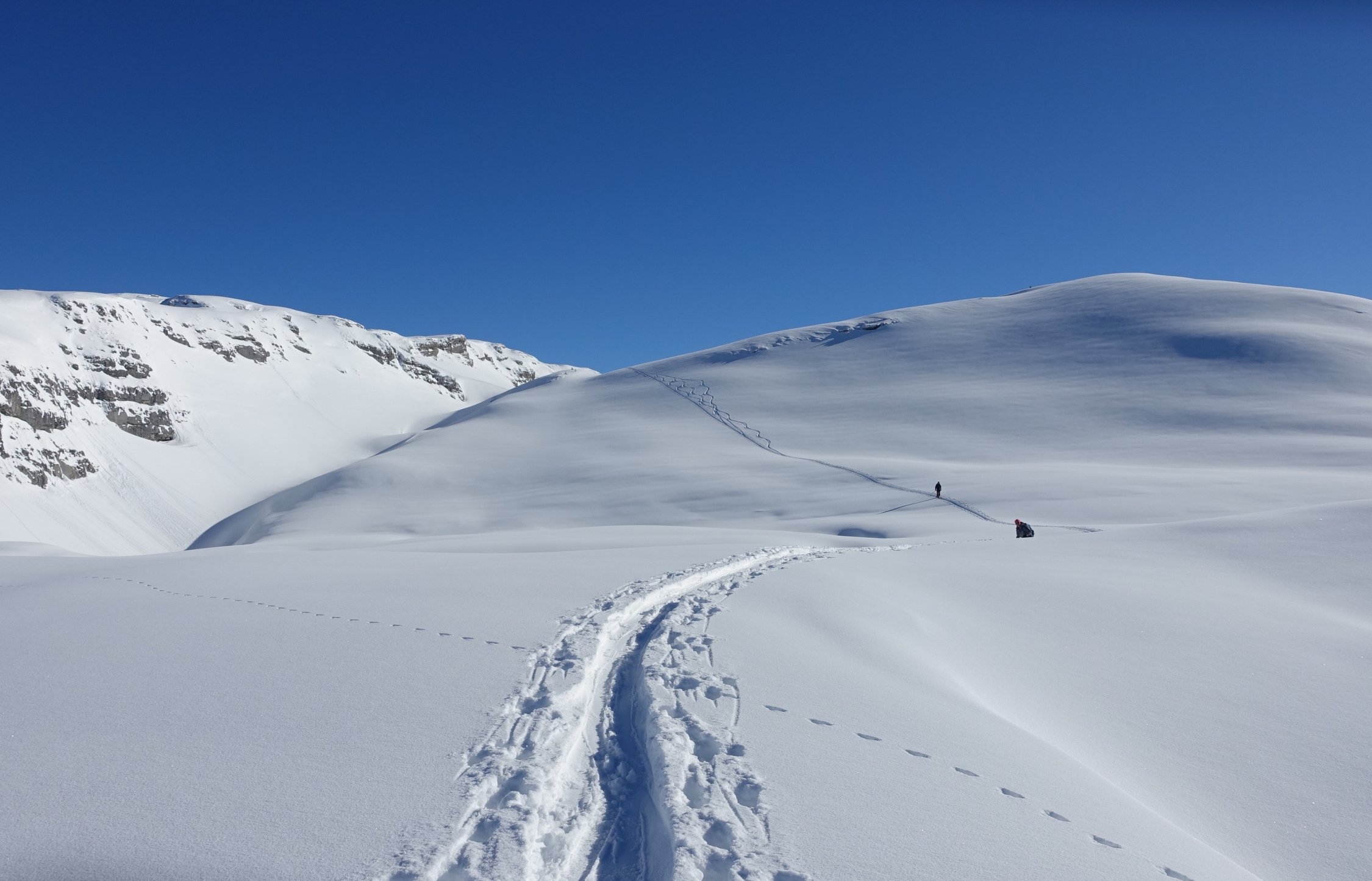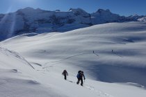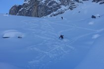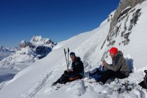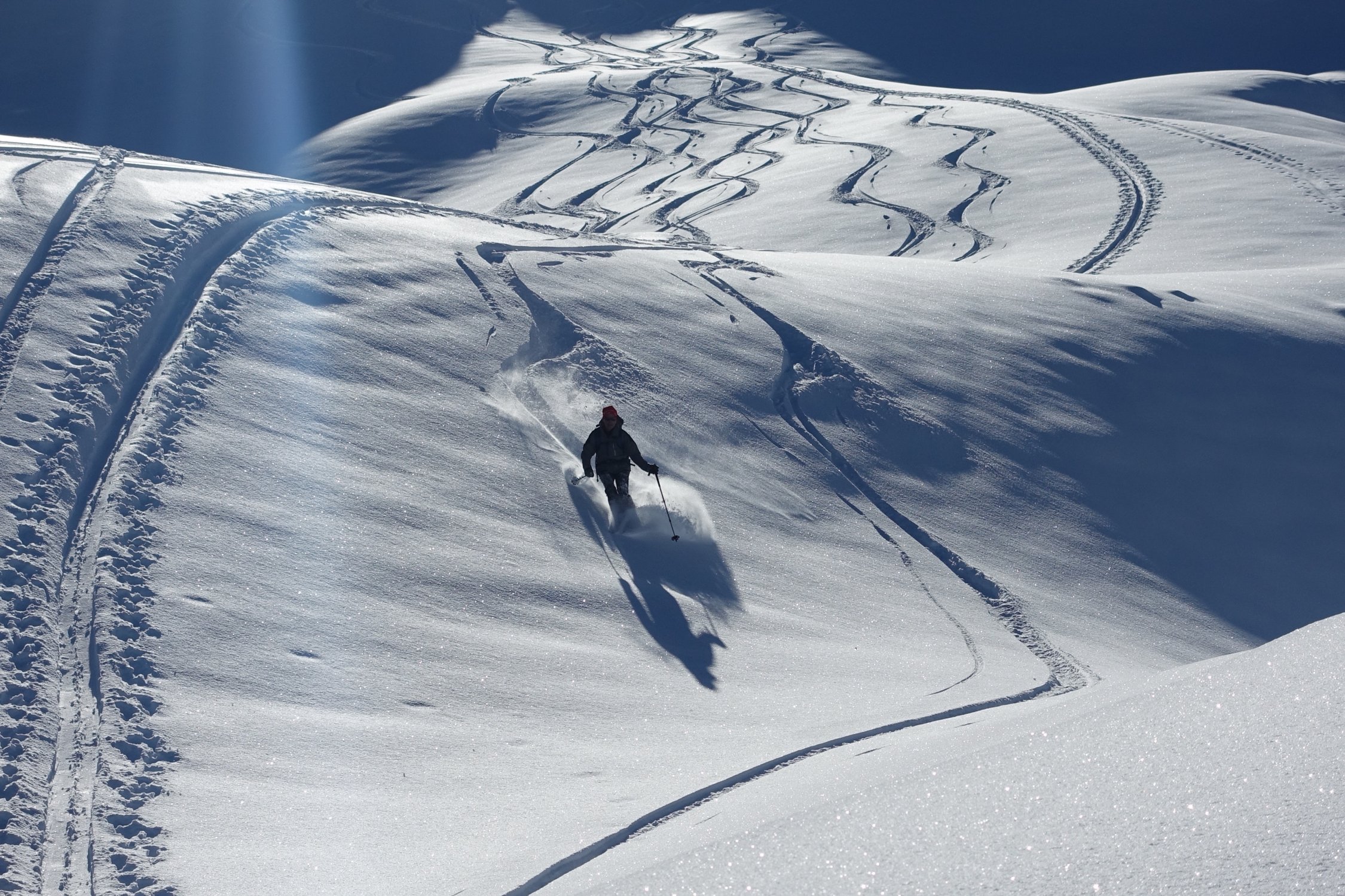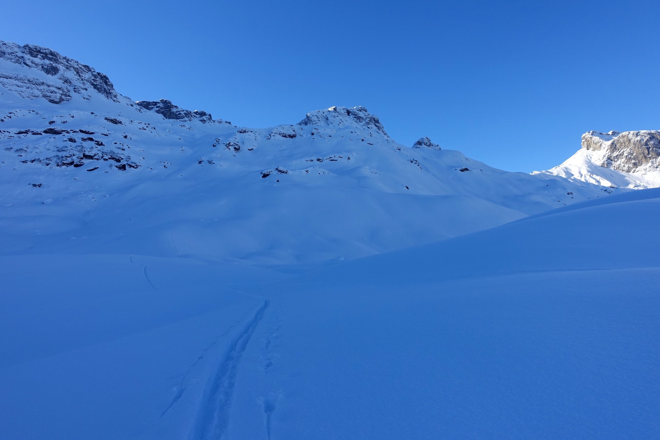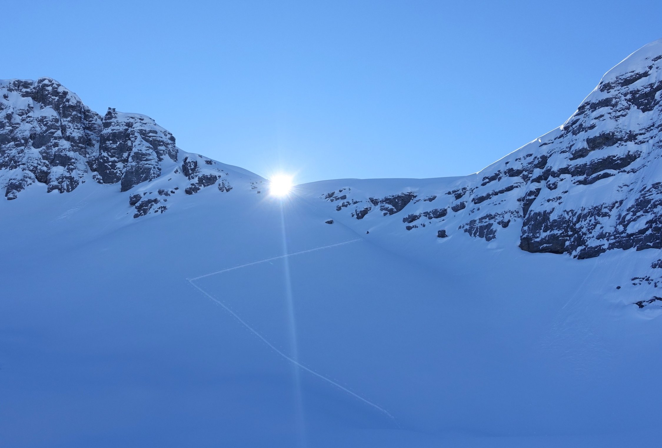 Ganz einfach super! Eine ganze Menge Powder vom Start weg bis zum Gipfel, bzw. umgekehrt. Nur gerade ganz zuoberst, im abgeblasenen Gipfelbereich muss man Obacht geben auf verdeckte Steine.