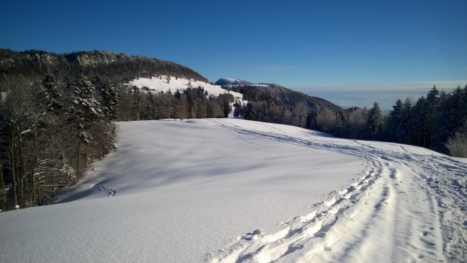 Es liegt schöner Pulverschnee in der Aufstiegsroute. Wie immer etwas windig, doch Sonnenschein. Etliche andere Ski- und Schneeschuhtouristen trafen sich auf der Hasenmatt. Abfahrt durch das Waldstück ist gut eingeschneit, die wenigen Schwünge bis zum Sattel, Punkt 1318, vor der Stallfluh im Pulverschnee. Hier kann man wählen: die steilere direkte Abfahrt in den Cholgraben oder kurzer Aufstieg zur Stallfluh. Die Abfahrt von der Stallfluh zum Stallberg und bis zum Waldeintritt in den Cholgraben lohnte den zusätzlichen Aufstieg: wunderbarer Pulverschnee. Mit der vorhergesagten Erwärmung wird es nicht mehr lange so bleiben. Die Abfahrt auf der Waldstraße durch den Cholgraben ist gut eingeschneit, keine Steine. Der letzte Hang zum Subigerberg dürfte etwas mehr Schnee haben. Fast selbstverständlich gehört zu dieser Tour der Aufstieg zum Oberdörfer und ein Stärkung zur Abfahrt nach Crémine. Dieser Abfahrt mangelt es im unteren Stück an genügend Schnee. Man nimmt besser die alten Ski mit. Ich benutzte nach der halben Abfahrt die Straße, die nicht gekiest war.