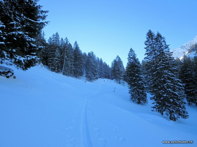 Abfahrt: Der Einstig in den steilen Nordhang unter dem Gipfel ist gut zu machen, Hupf über eine kleine Wächte, keine Rutsche. Auf der ganzen Abfahrt toller Pulverschnee auf guter Unterlage. Nur ein kurzer Teil oberhalb Rietboden liegt in der Sonne, der Rest kühl im Schatten. Auf den letzten Hängen oberhalb Mühlehorn gab es einige Graskontakte.