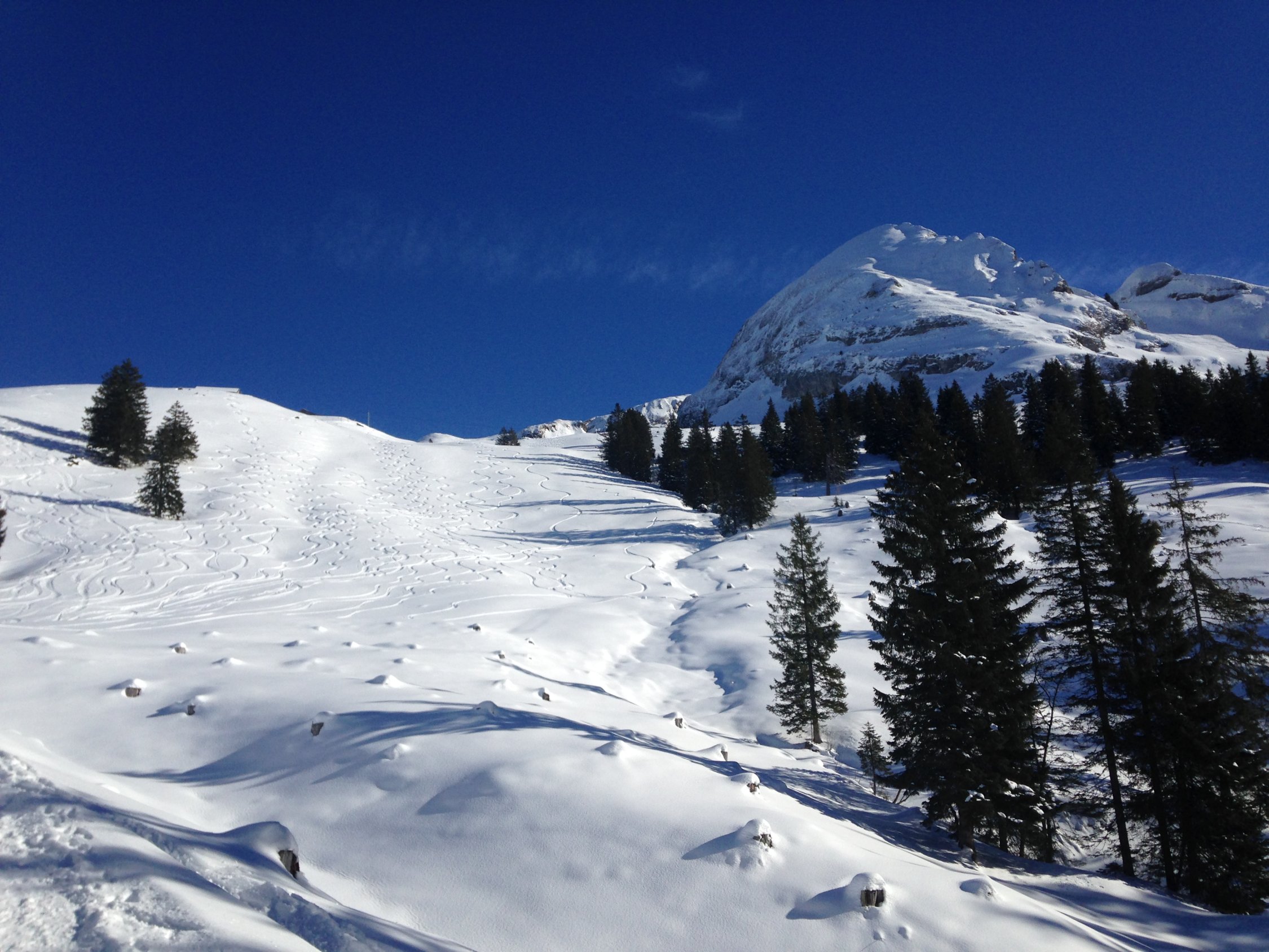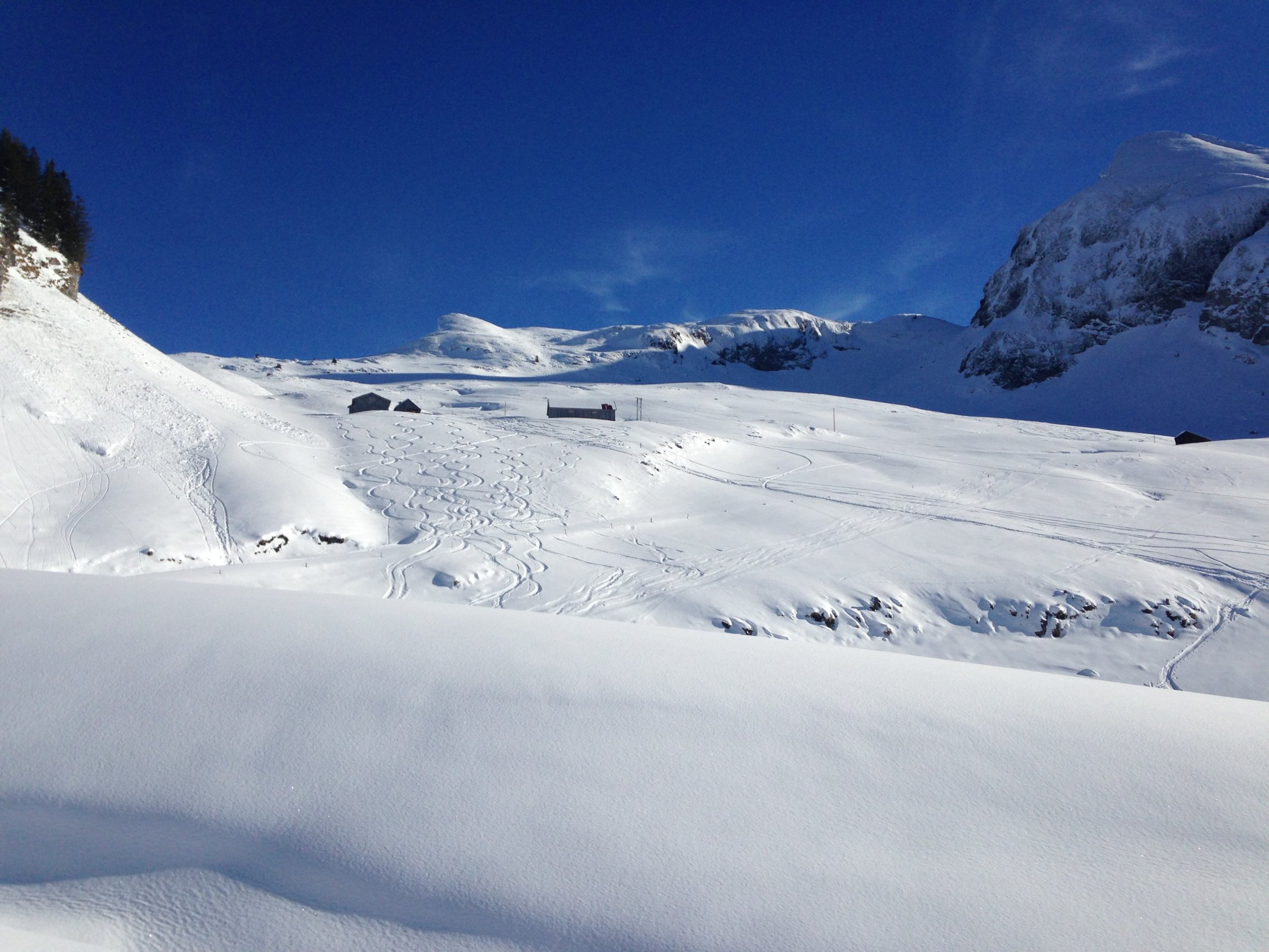 Sehr gute Verhältnisse, Pulver durch und durch. Keinen Steinkontakt heute. Es hat noch genügend Platz für ein paar Schwünge.