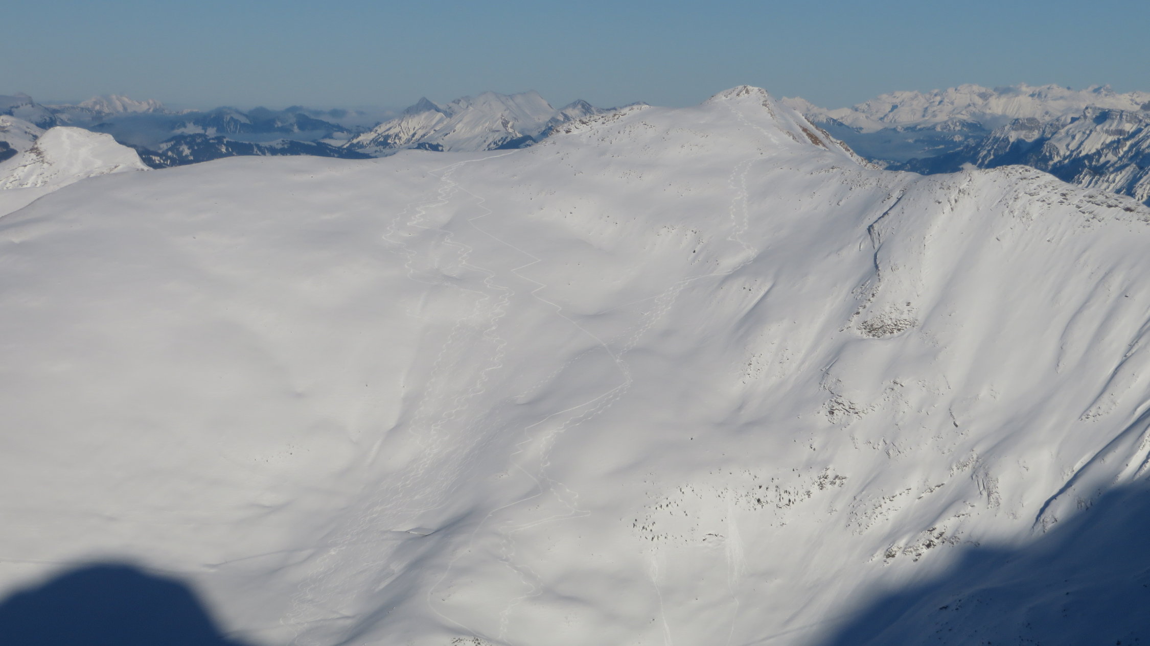 Wir sind heute erst um 11.Uhr gestartet und machten zuerst den Gurbsgrat und danach durften wir noch das Cheibehore Spuren und als erste Abfahren.16.45 Uhr wieder bei der Säge.