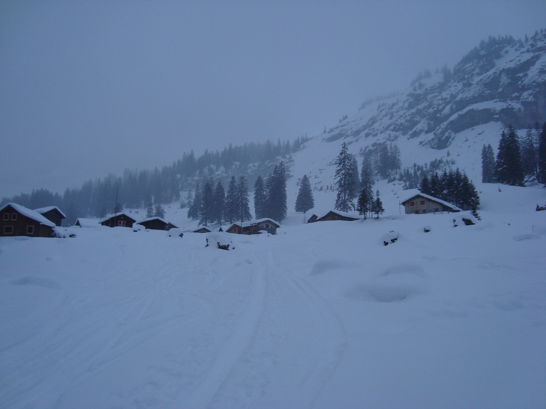 Die Schneedecke war bis zum Wald oberhalb Brunni(ca.1600M.ü.M.) sehr durchfeuchtet, ab da zunehmend trockener mit wachsender Neuschneeauflage.