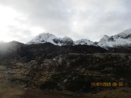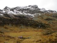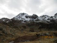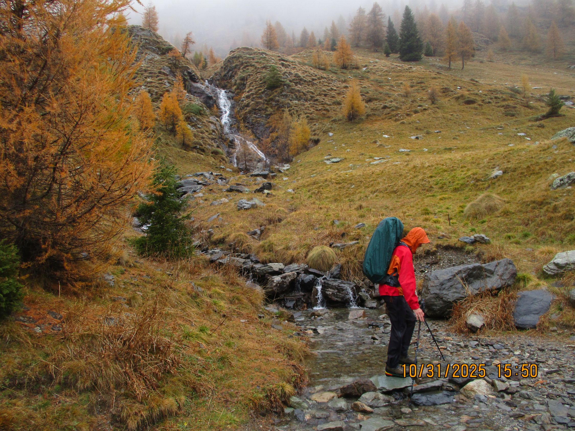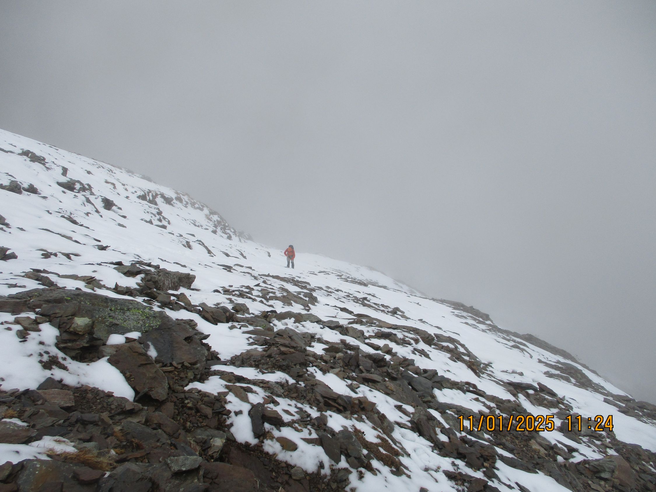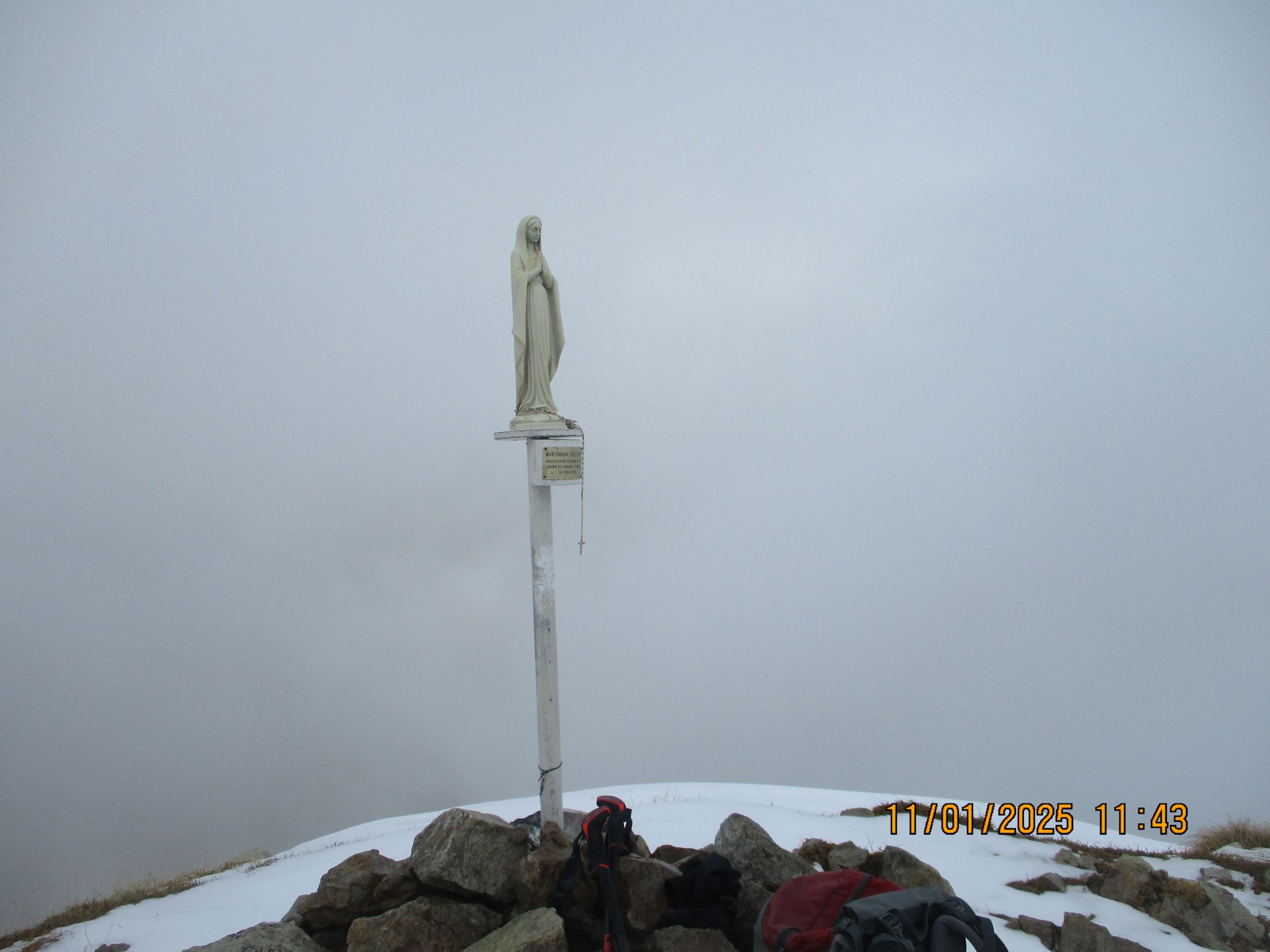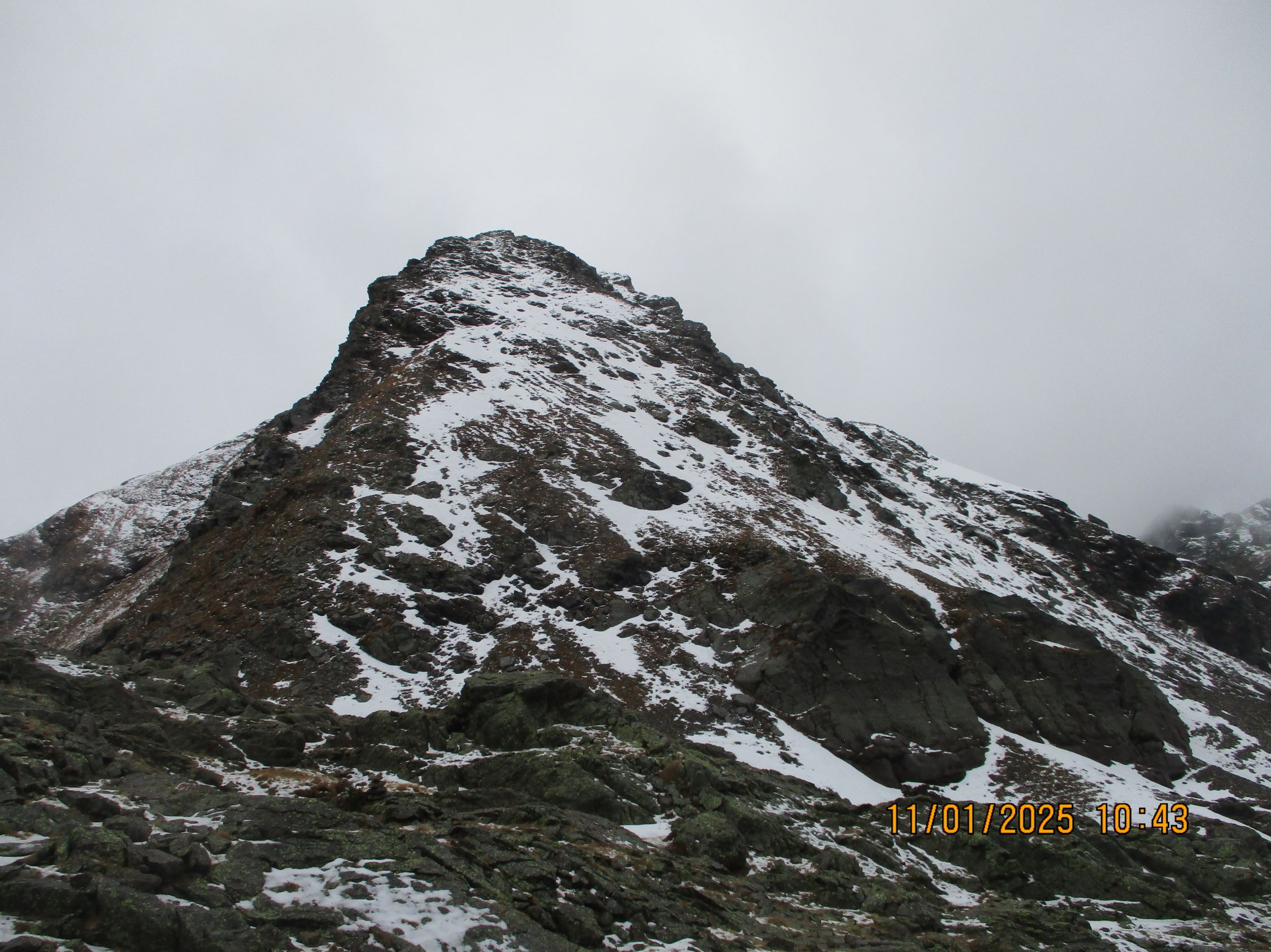 Aufstieg am Vortag zum Rifugio Calvi bei Nieselregen. Am folgenden Morgen schienen sich während des Frühstücks die Wolken lichten zu wollen. Fakt ist, dass wir auf dem Gipfel nichts sahen. Für die Aufstiegsroute durch die Nordostflanke hätten wir uns im oberen, sehr steilen Bereich einen Stütz- und Bremspickel gewünscht, doch wir waren nur mit Stöcken unterwegs. Heikel zum Teil rutschige Platten unter etwa 10 bis 15 cm Schnee. Der Schnee ließ sich gut treten, Steigeisen erübrigten sich. Leichte Hochtourenverhältnisse.