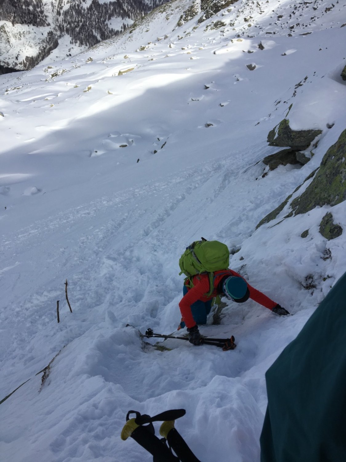 Der Wind der letzten Woche hat gute Arbeit geleistet. Der Grat zum Stockhorn ist zuoberst schneefrei. Bis ca. 40m untern den Gipfel können aber die Skier angelassen werden. Wir haben uns jedoch entscheiden ein Skidepot vor dem flachen Grataufstieg zu machen. Der Rest ist easy auch ohne Skier zu machen, da schon ziemlich wenig Schnee liegt. Auch die Steine oberhalb von Dri Stafle waren zu sehen. Die grossen kann man umfahren, jedoch hat es noch kleine, welche ganz knapp vom Schnee bedeckt waren. Daher war die Abfahrt mehr Skischule mässig: Einer hinter dem anderen und ziemlich in der Linie der Aufstiegsspurt. Im Wald unten wurde es dann besser mit den Steinen, jedoch war da der wenige Schnee schon von den ca. 12 Leuten vor uns verfahren worden.