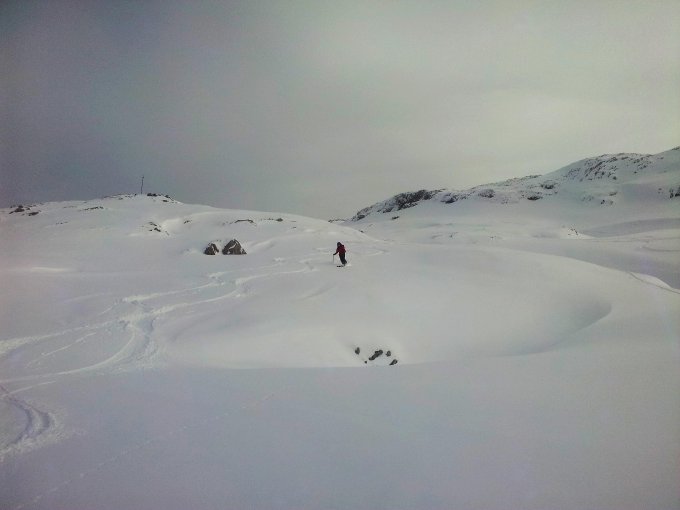 Schneelage bestens, keinerlei Boden- oder Steinkontakt. Bis etwa 1.600 m Harsch oder Bruchharsch, oberhalb zunehmend pulvrig. Pulver teils etwas schwerer oder windgepresst, aber insgesamt gut zu fahren. Die untersten 300 hm lassen sich mit leichtem Gefälle angenehm auf der Passstrasse zurücklegen.