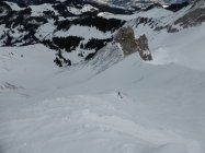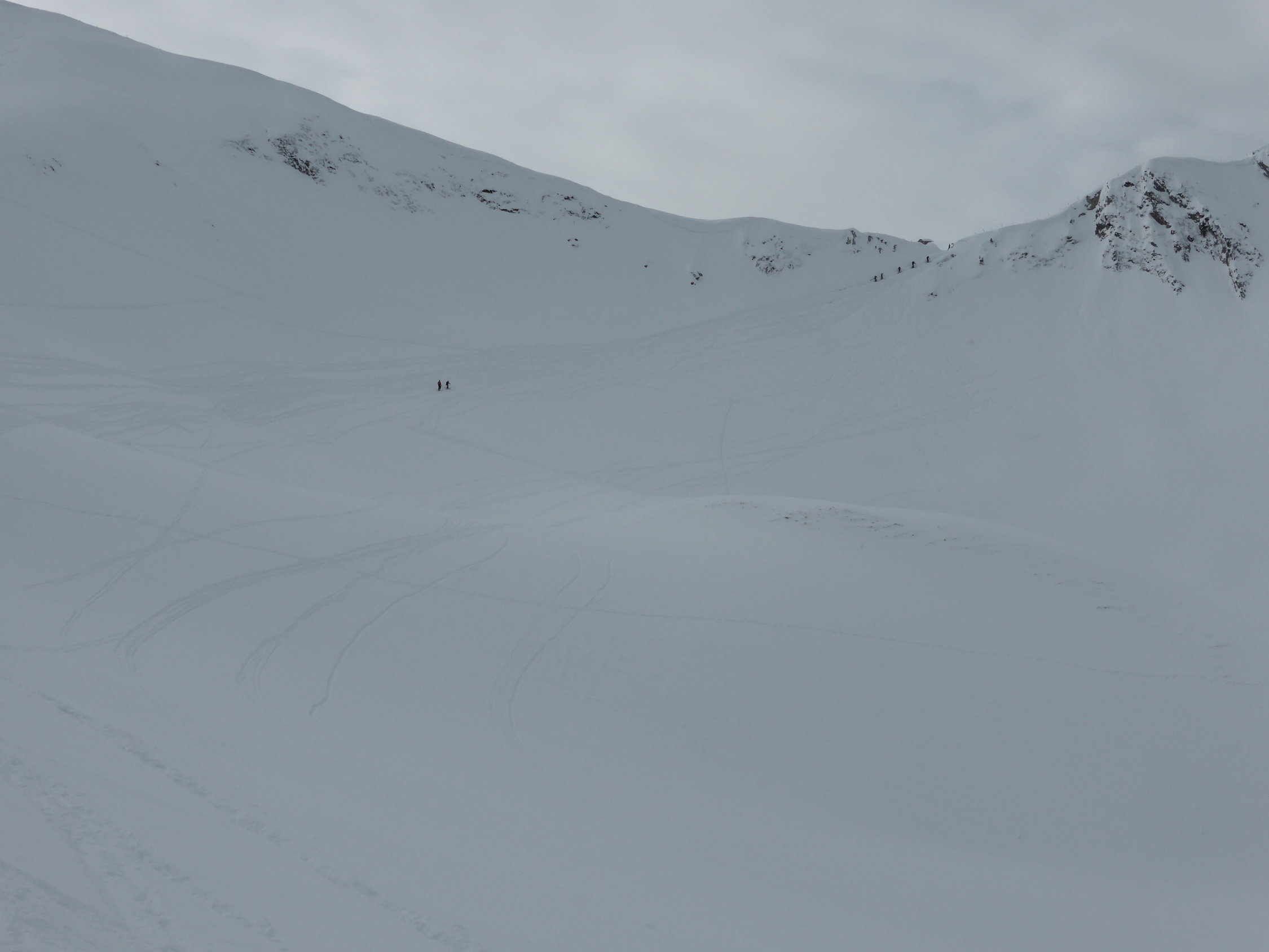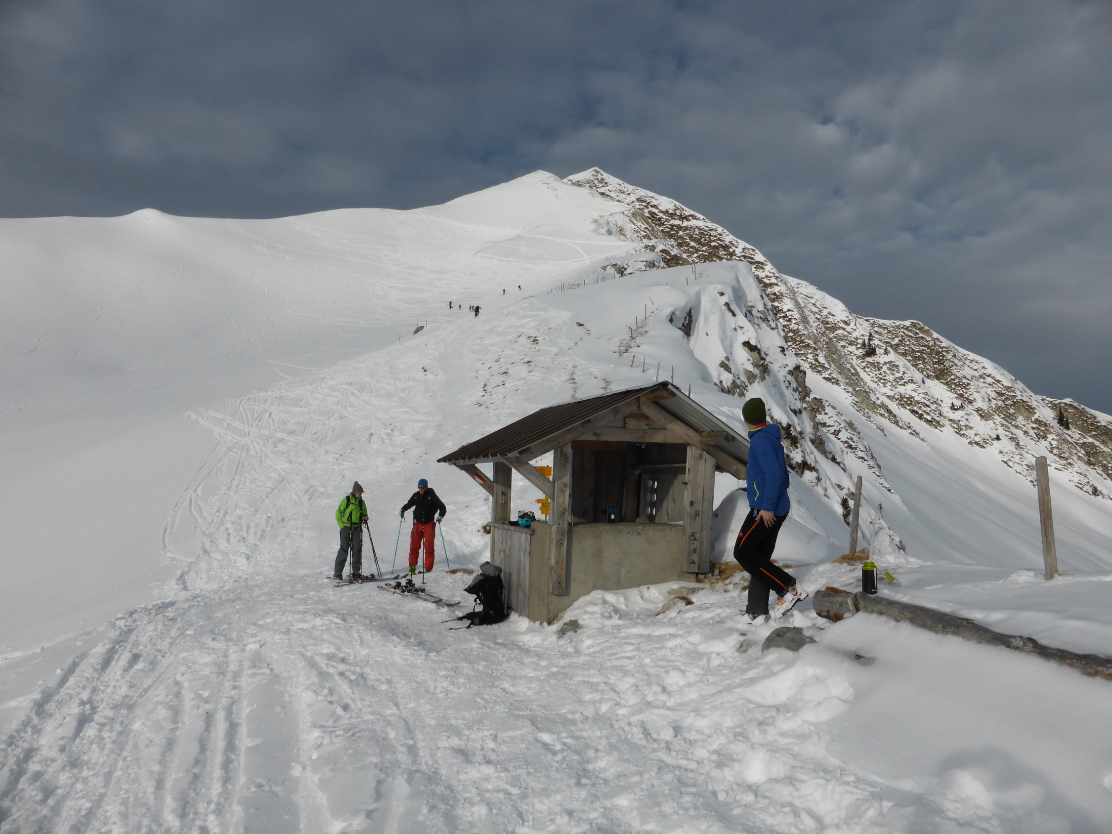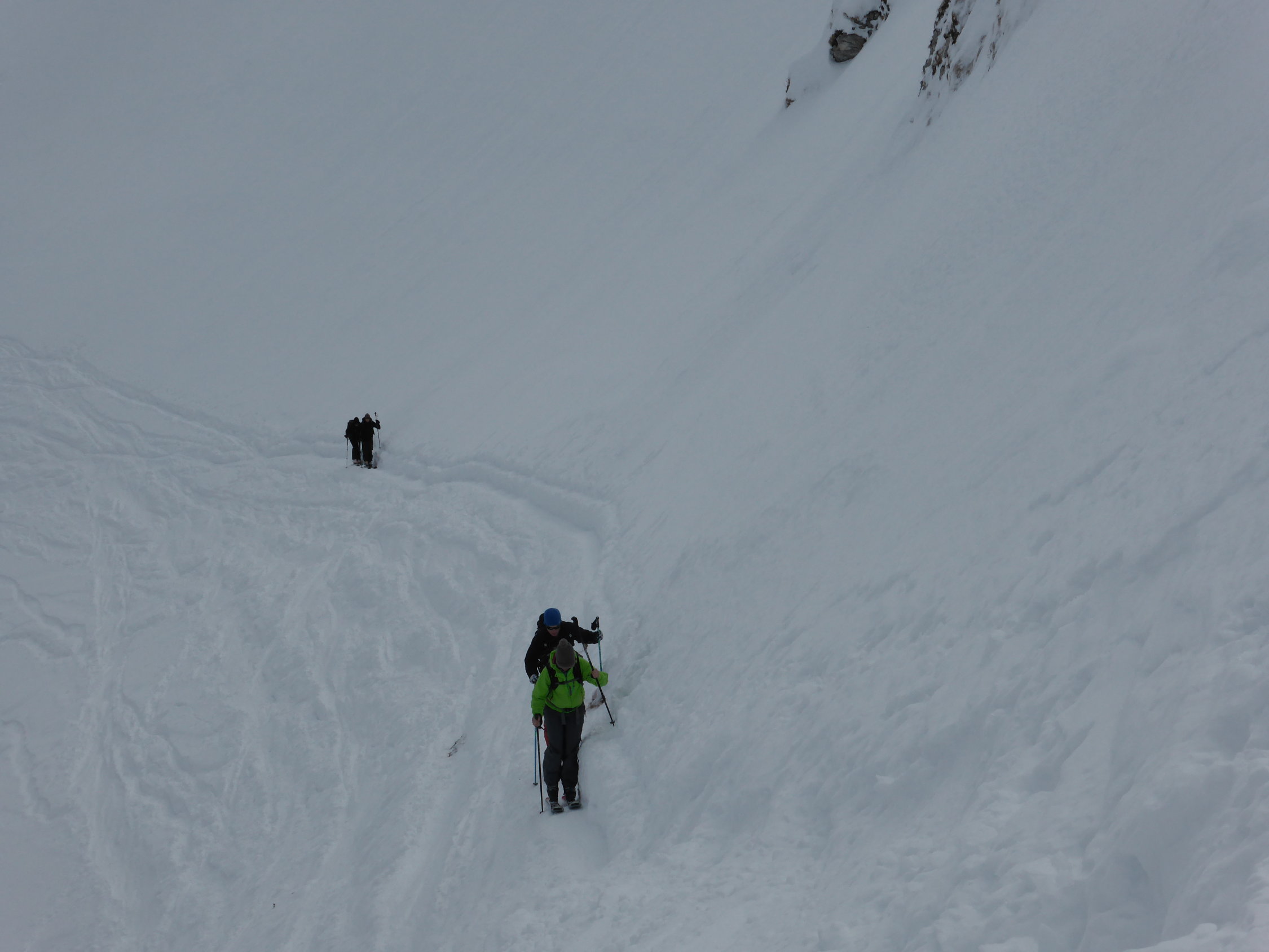 Leider hat es Freitagnacht bis zum Gipfel geregnet. Folglich Bruchharsch der unangenehmsten Art. Desshalb auf Abfahrt durch die Nordflanke verzichtet.