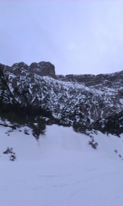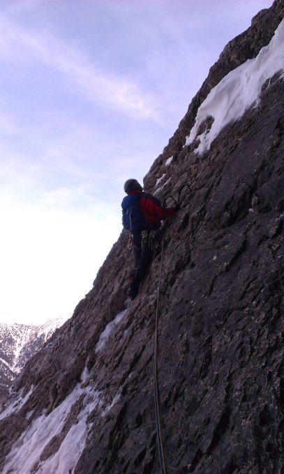 Insgesamt recht gute Verhältnisse. Es hat wie erwartet einiges an Schnee, der durch die hohen Temperaturen der letzten Tage gut aufgeweicht ist. Für den Zustieg sind daher Ski oder Schneeschuhe sehr zu empfehlen. Die erste Seillänge hatte einiges an Eis zu bieten und war daher sehr genussvoll zu klettern. Die drei M4 bzw. M5 Längen waren ziemlich trocken. Durch die hohen Temperaturen war der Fels wohl nicht wie sonst schön zusammengefroren und daher streckeweise recht brüchig (3. und 4. Seillänge). Der Schnee in der Wand hatte von Pulver über Sulz und ab und zu mal Trittfirn alles zu bieten.