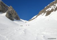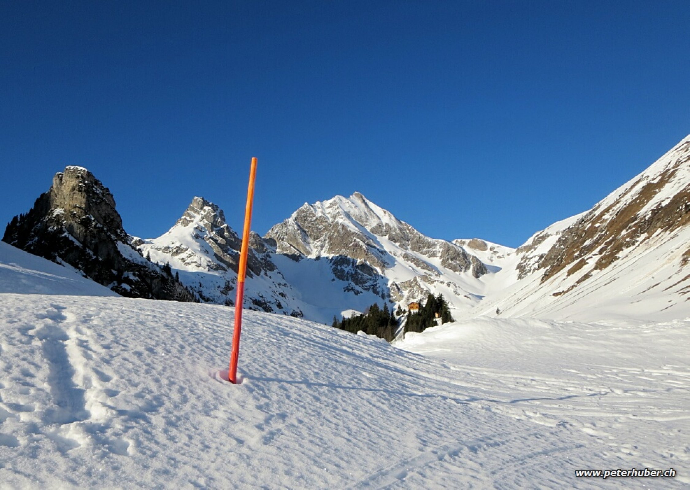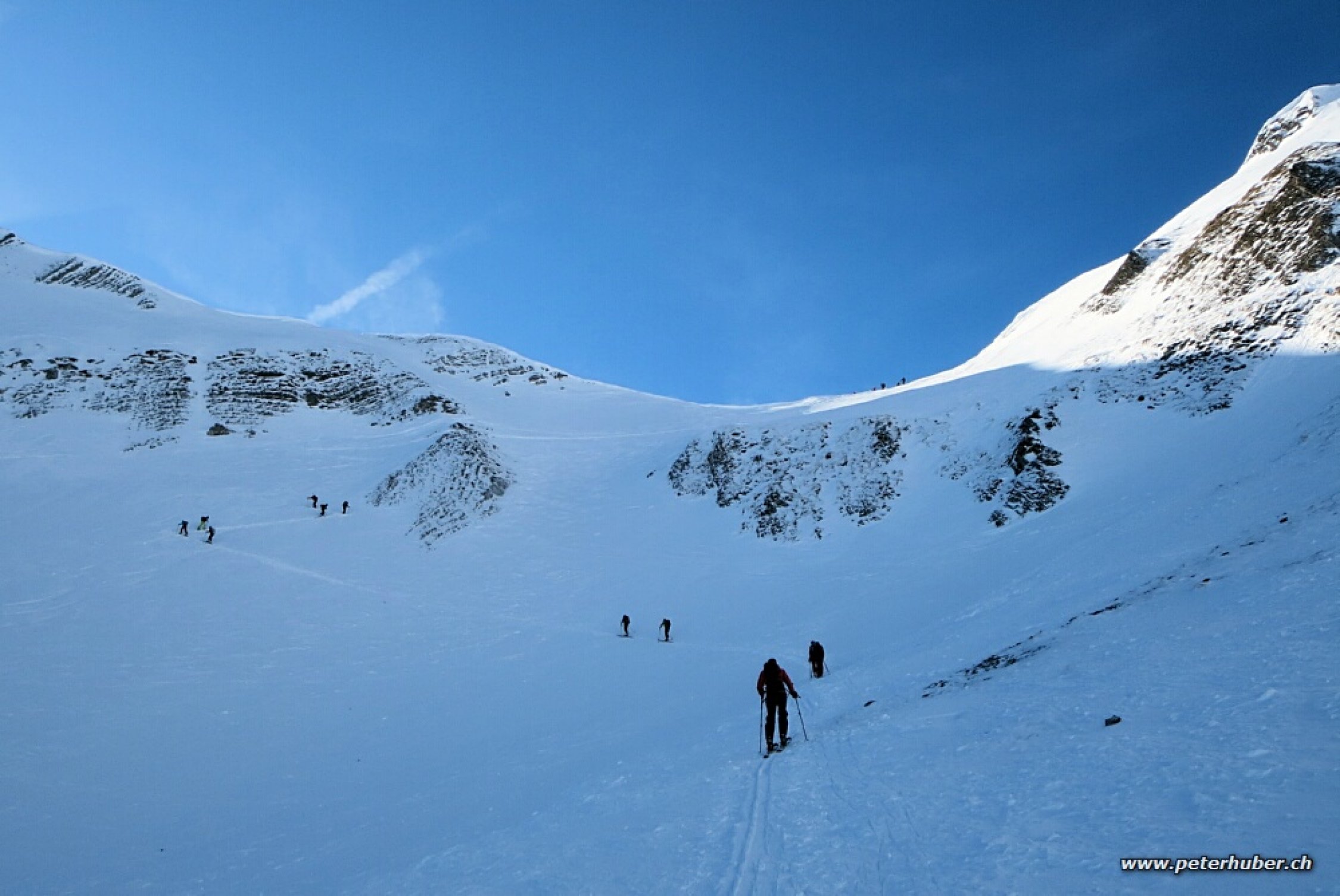 Tolles Wetter, später ein paar Schleierwolken. Ab dem Sattel bis zum Gipfel kalter Wind. Es hat genug Schnee auf der ganzen Tour. Um 8:30 Uhr keine Wartezeit an der Seilbahn. Im Aufstieg ist man lange im Schatten. Der steile Aufstieg zum Sattel konnte heute mit 6 Spitzkehren bewältigt werden - gute Spuranlage, danke. Vom Sattel fast ganz ohne Schnee zu Fuss auf den Gipfel.