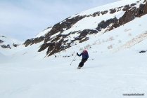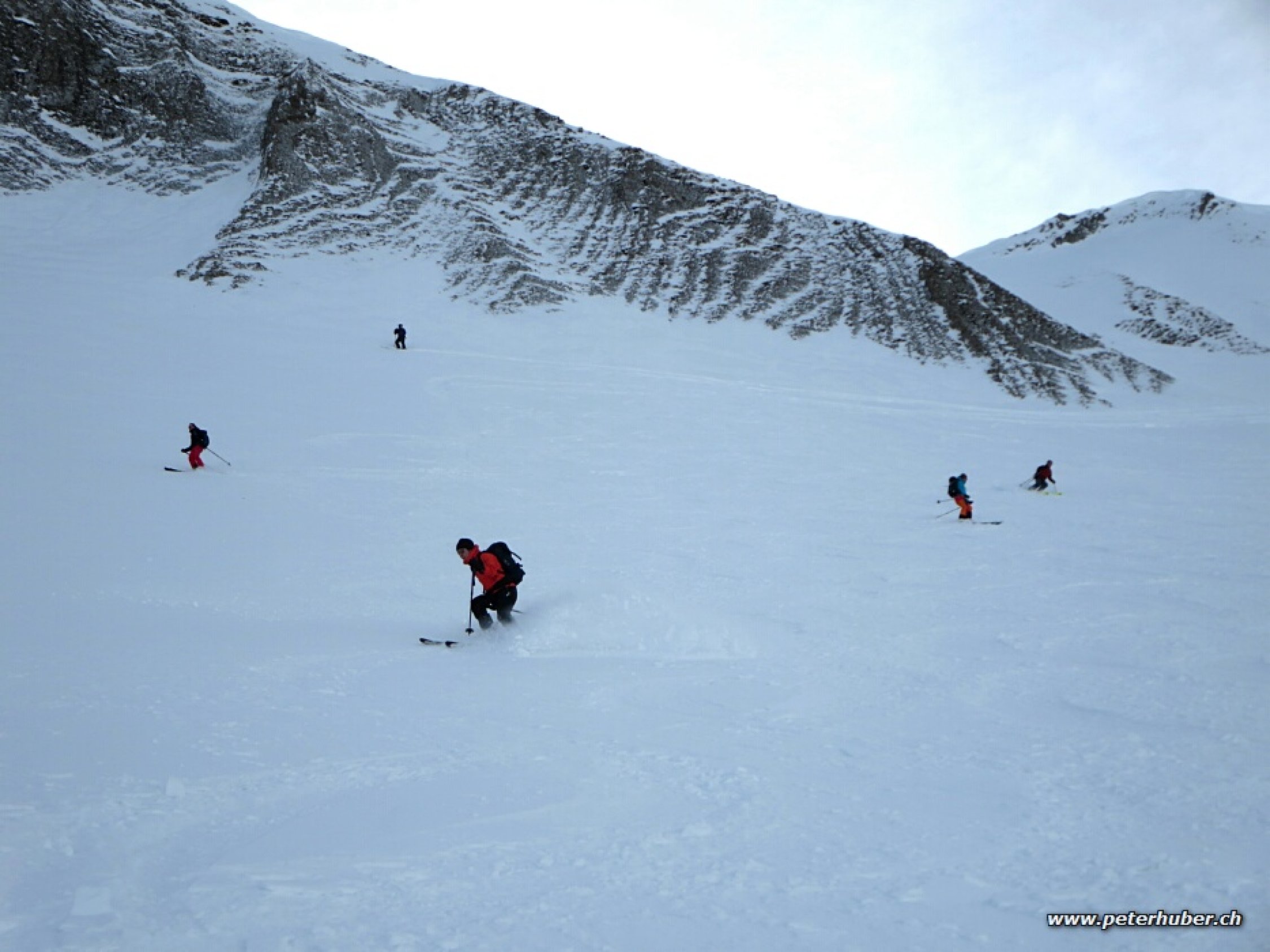 Abfahrt: Zuerst schöner Pulver in den Schattenhängen, dann pistenhaft, kurz mal leichter Bruchharsch und unten schöner frühlingshafter Sulzschnee. Kurzum sehr schön, ein Genuss.
