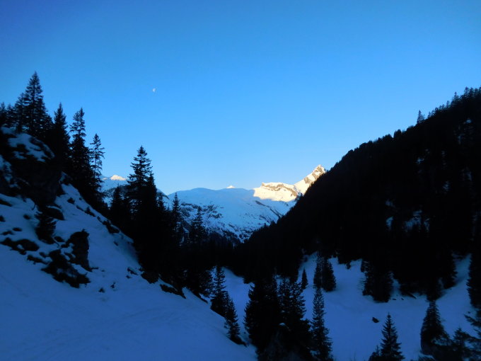 mit der Sonne kam auch der erste Pulverschnee der den Aufstieg sofort leichter machte, im Schlussteil lagen etwa 10 cm Pulverschnee vom feinsten bis zum Skidebot, der Schlussaufstieg zum Gipfel wurde am Vortag schon begangen und hatte einen guten Trittschnee bis zum Gipfel, Abfahrt schöner Pulverschnee vom besten, im Gebiet Geitenberg sogar Sulzschnee, Richliswald dann sehr schwierige Abfahrt mit einer Fusspassage und Skifahren am Limit.
