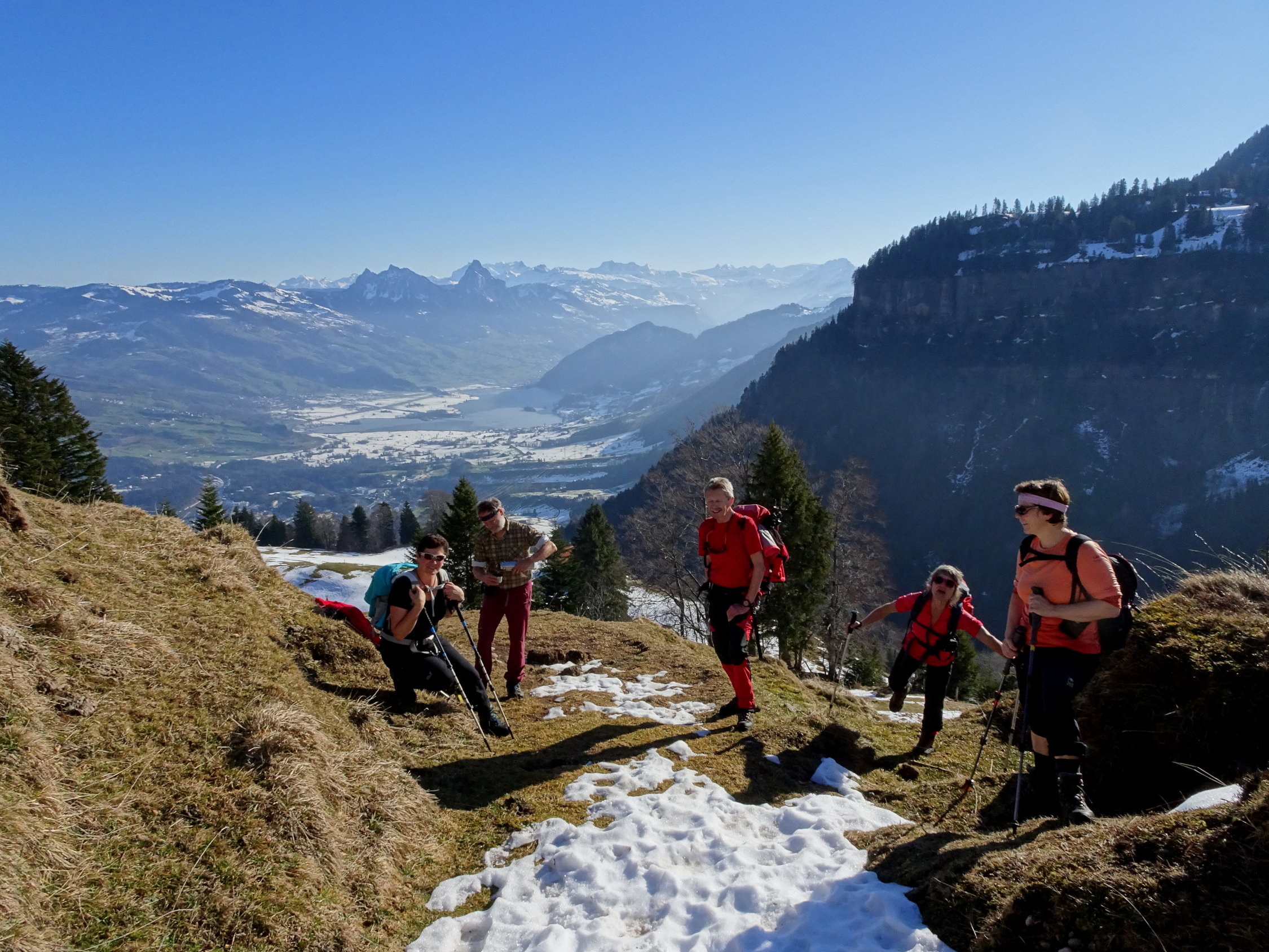 Anstelle einer Schneeschuhtour wurde wegen Schneemangel, eine Alpine Wanderung, was genauso schön war. Die ersten harmlosen Schneeflecken begannen ca. bei 1300 m. bis zuoberst konnte man sie umgehen oder mit kleinem Aufwand durchqueren.