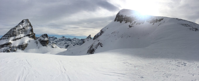 gefestigte Schneeschicht. Recht viel Schneeverwehungen, d.h. an exponierter Lage schauen Steine und Gras raus. Abfahrt bis nach Chäppeliberg bedingt möglich, man muss die Ski die ca. letzten 100 Höhenmeter runtertragen.