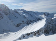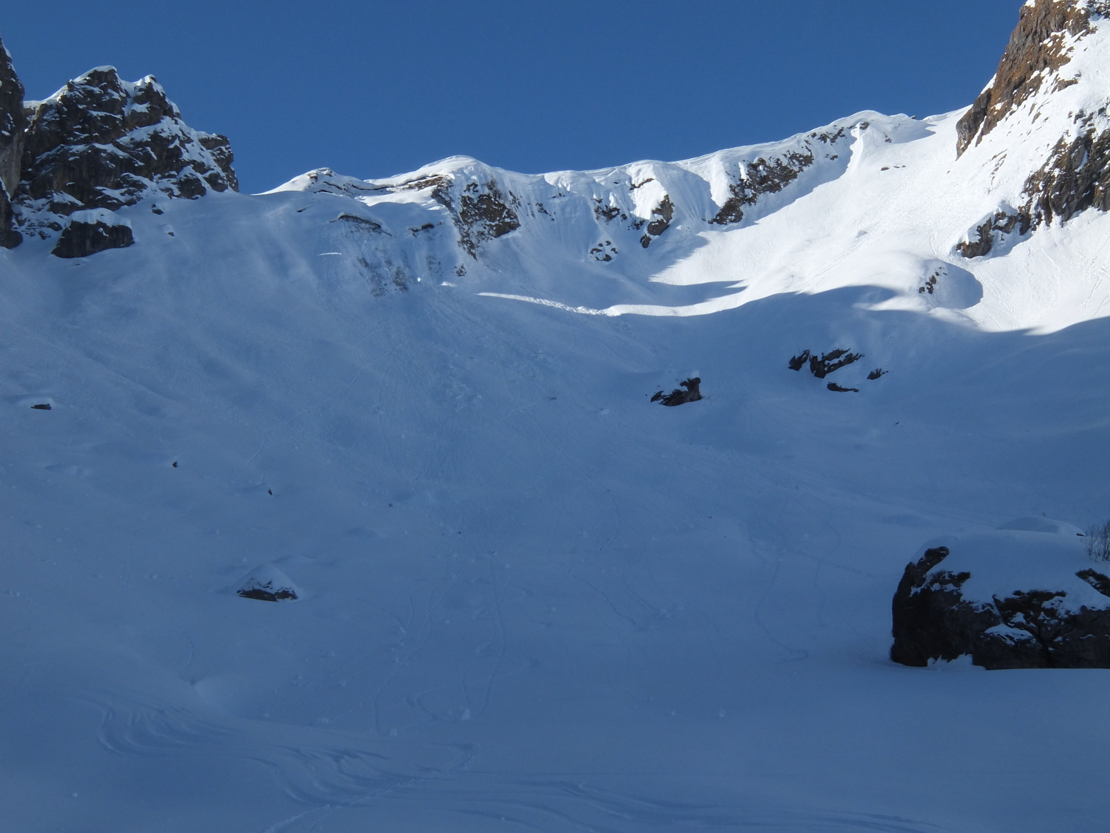 Alpweg mit einigen Lawinenstrichen und Eisschlag. Bis kurz vor dem Kar hart. Im Aufstieg zur Scharte Gegenverkehr durch abbrechende Wächtenstücke. Bei Ausnutzung der Topographie kann den Rutschbahnen ausgewichen werden. Dort wo die Sonne hinkommt aufgefirnt. Im Schatten schwerer Pulver und Triebschnee.