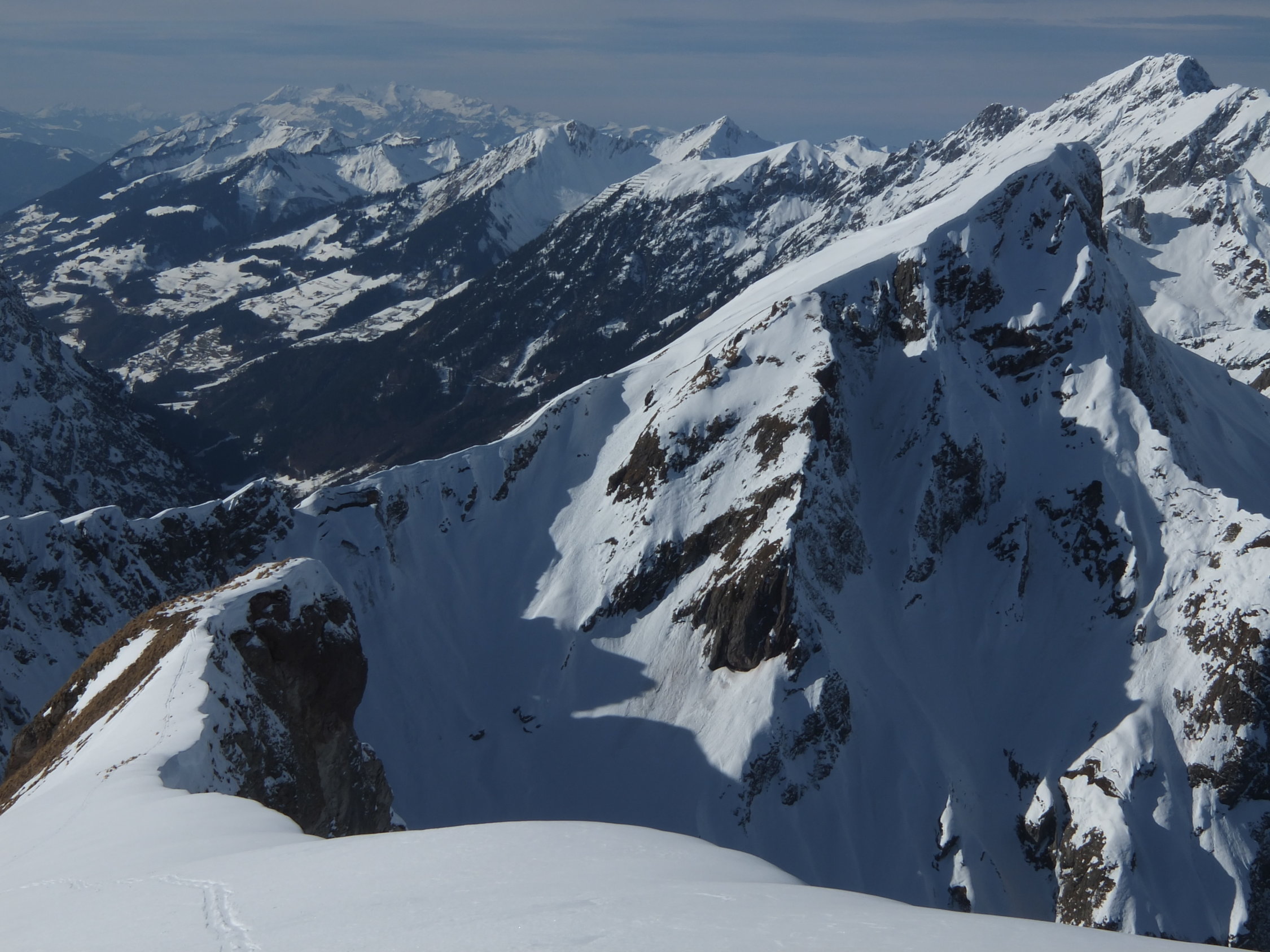 Schöne Abfahrt bis unter die Felsen des Hothorns im Pulver, dann Harsch und bruchharsch.