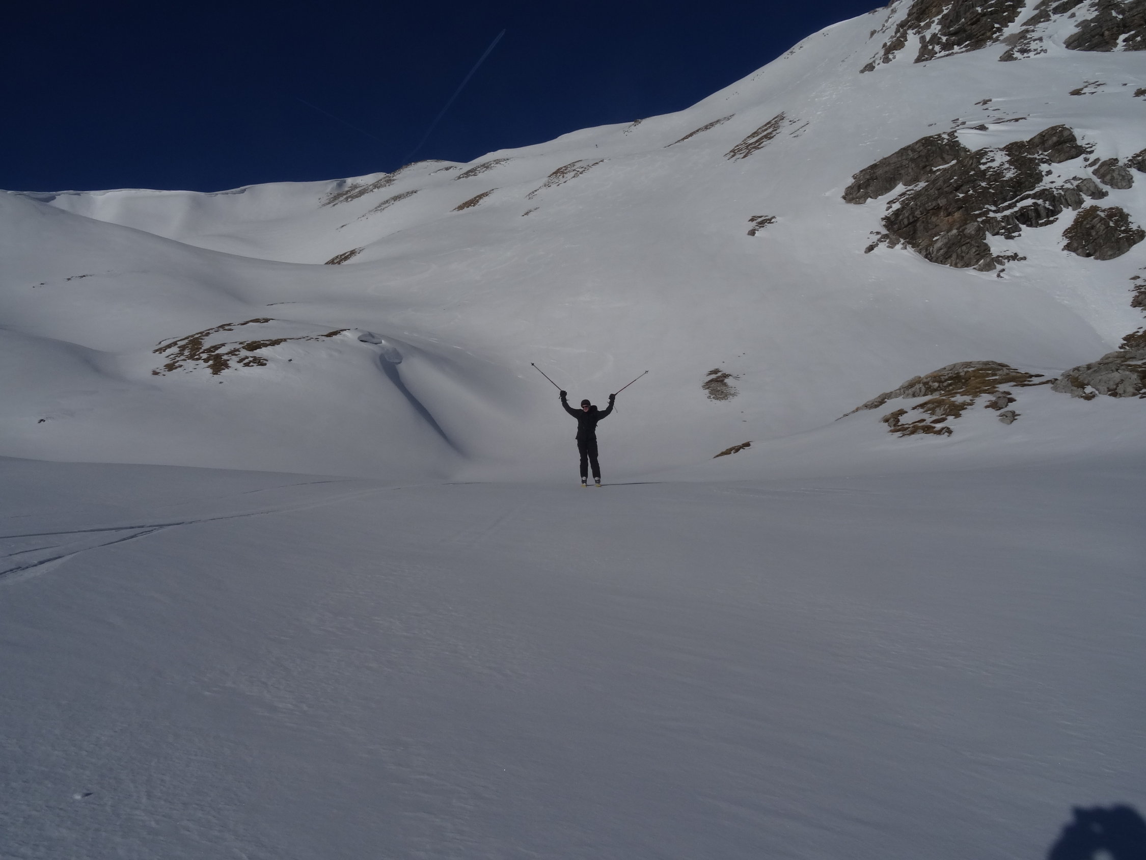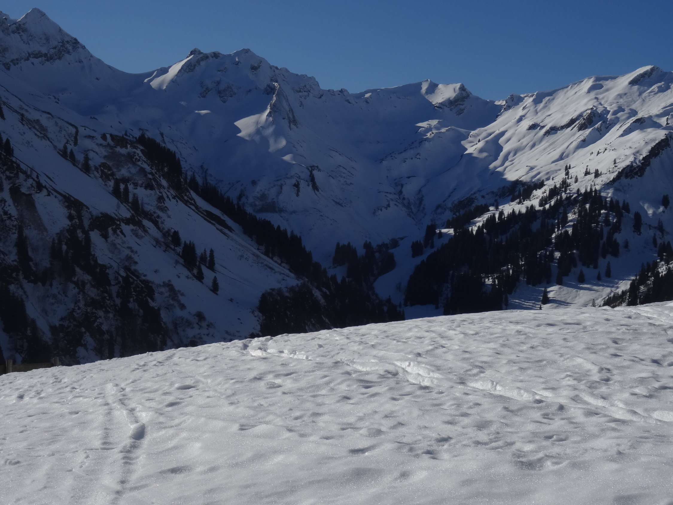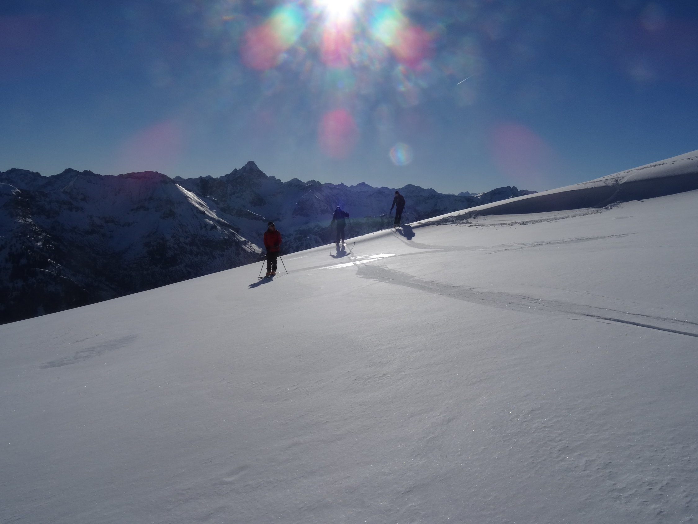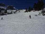 erste Abfahrt über sanfte Mulden vom Koblat mit leichtem "Puder" auf Harsch,