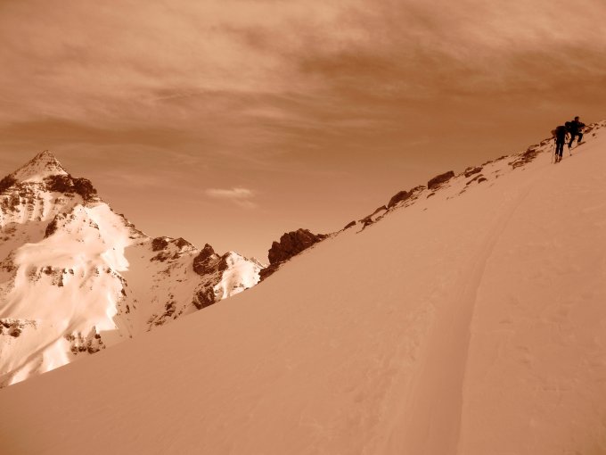 Verhältnisse für den Aufstieg bis unter Steilstufe tiptop. Die Spur ist jedoch stellenweise etwas steil angelegt (Harscheisen können im oberen Teil hilfreich sein). Aufstieg über Steilstufe kaum möglich. Am besten die Skier kurz tragen.