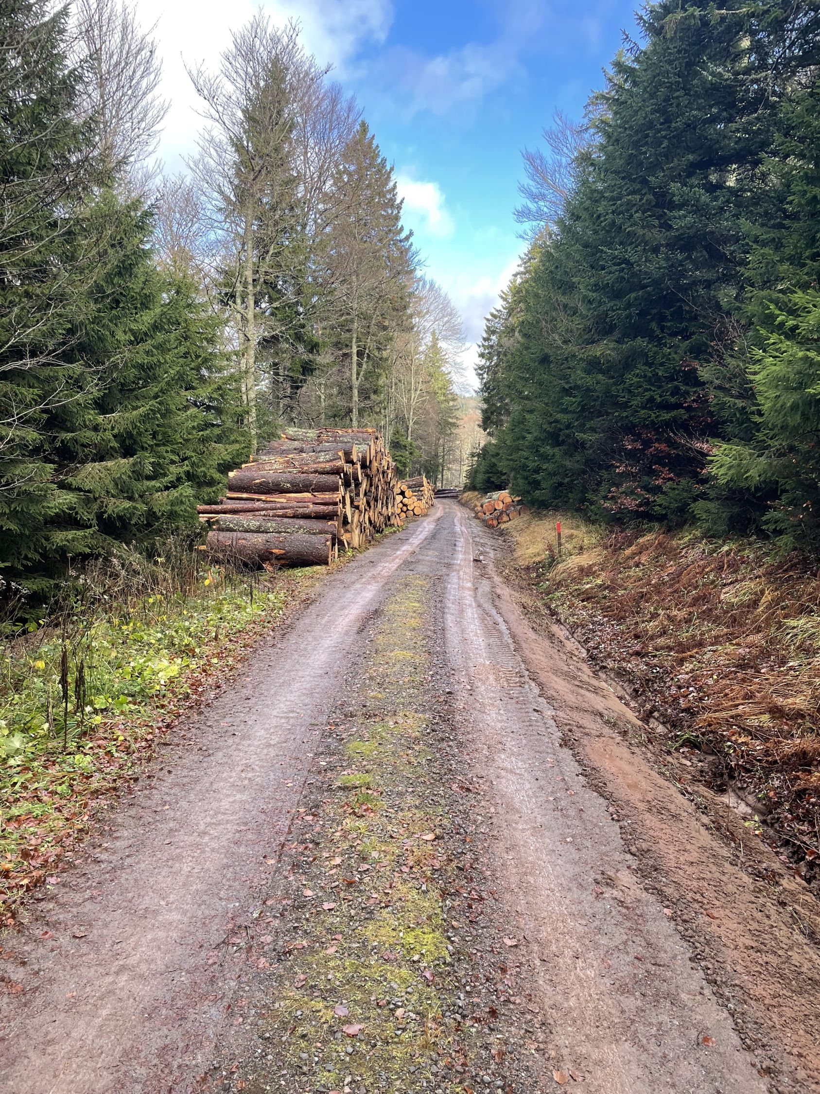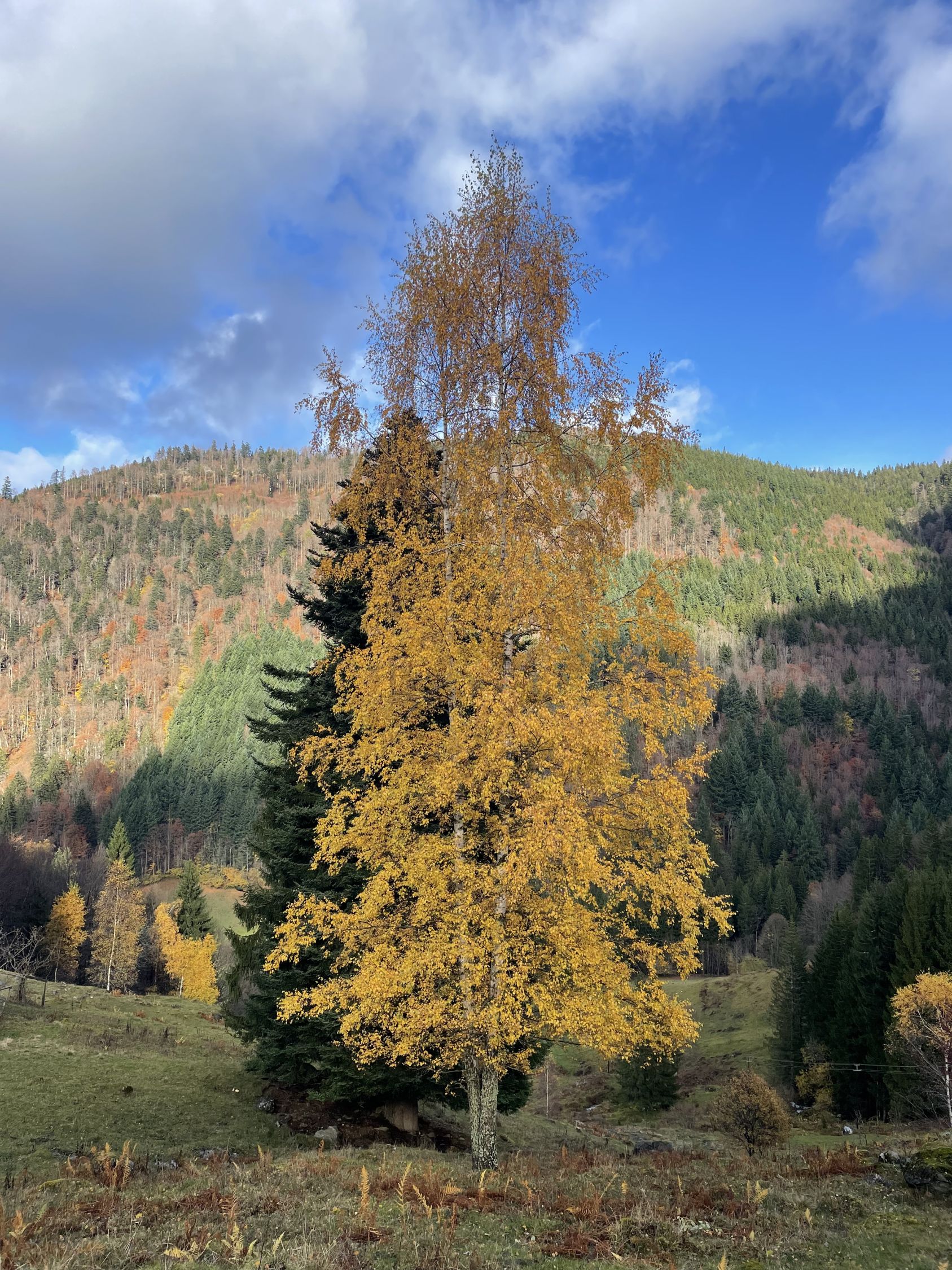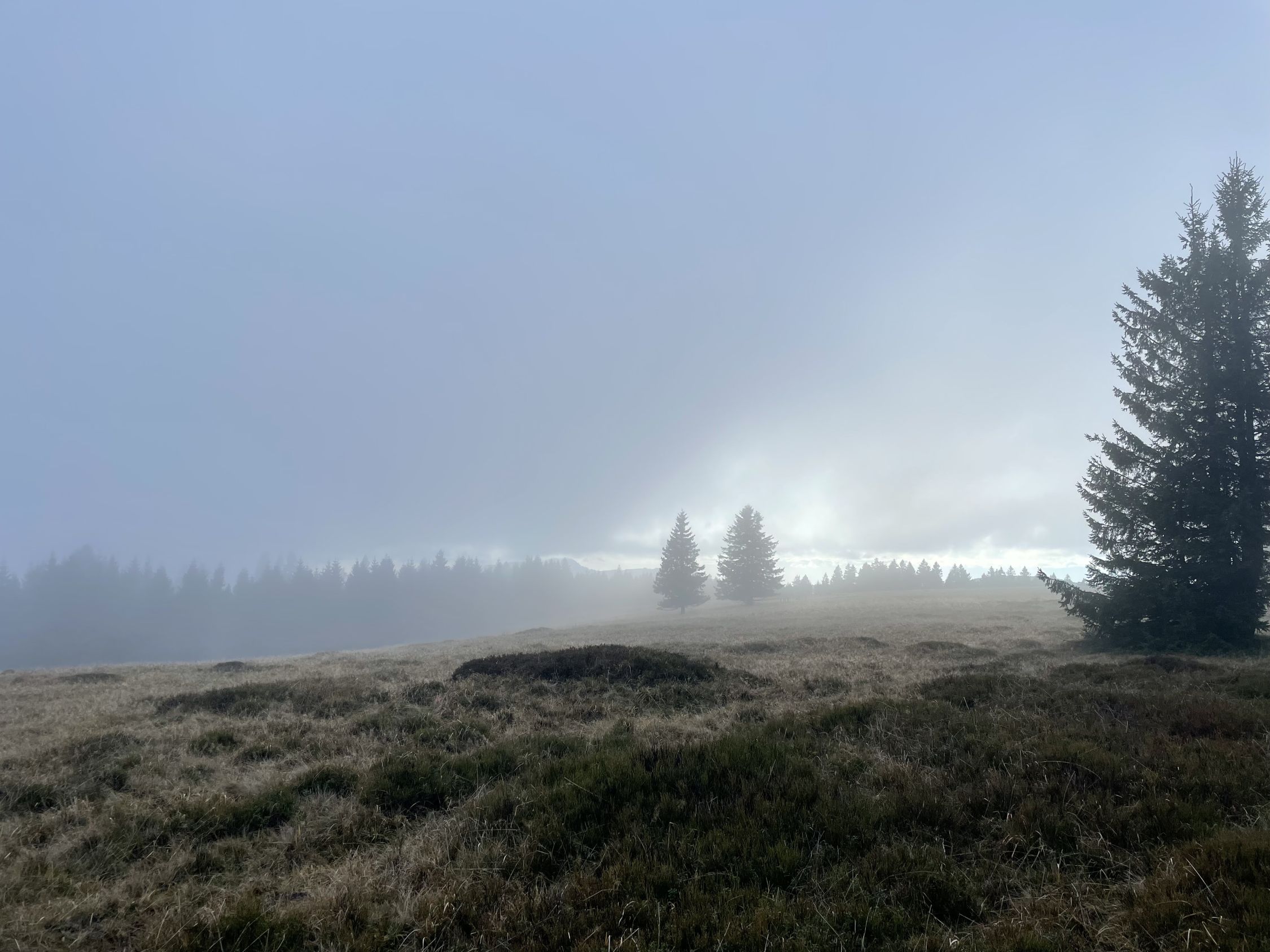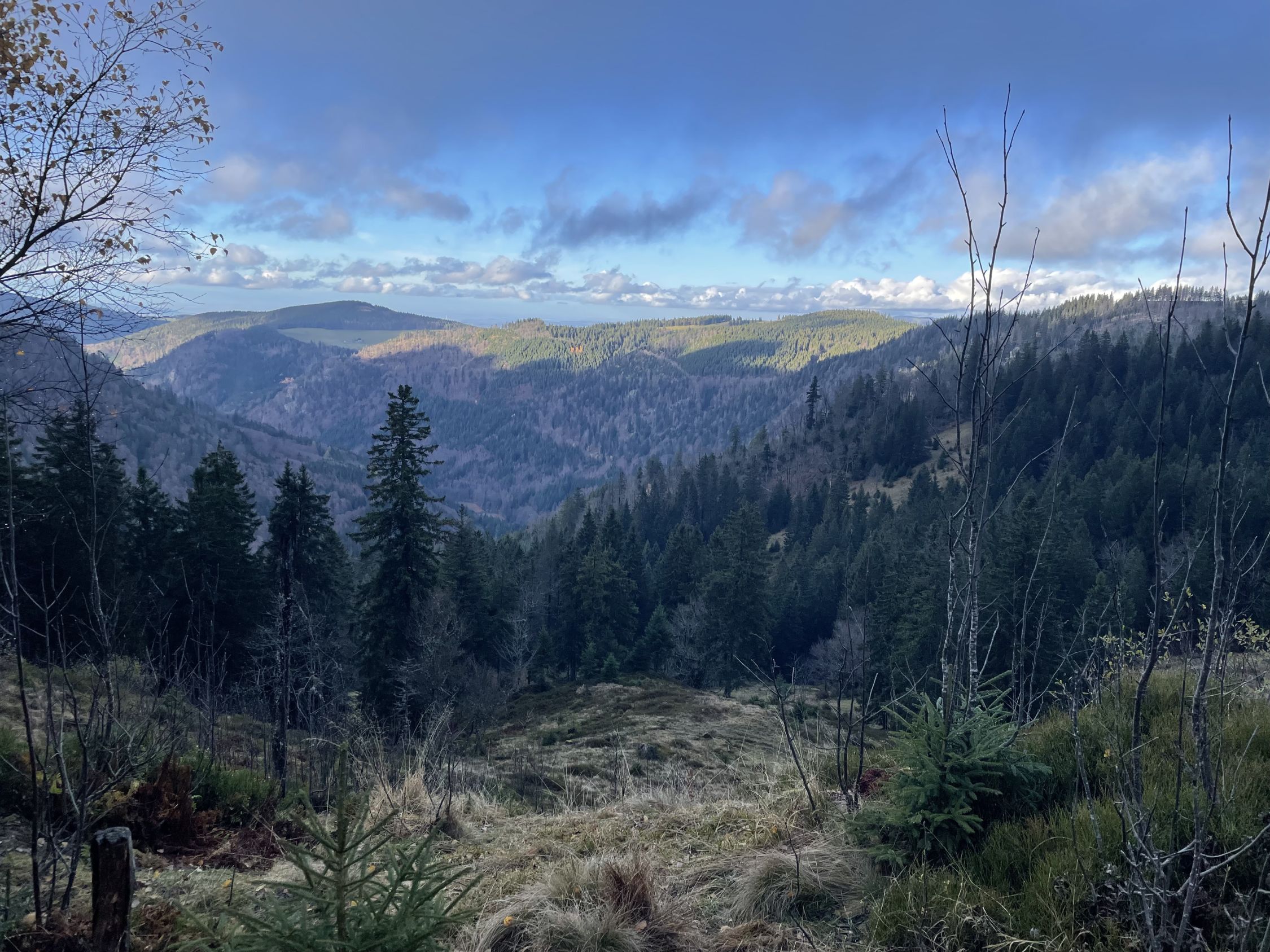 Die heutige Runde könnte man ganz unterschiedlich beschreiben, deswegen war ich auch mit der Bewertung unsicher (gut oder machbar?), man könnte beides geben. Generell war alles sehr nass, viel Wasser auch auf den Wegen, die teils kleinen Bächen glichen. Vor allem der Abstieg ins Wilhelmer Tal war diesmal eher hässlich, der Weg teils von Forstarbeiten schlammig. Herbstgold musste man suchen, ich wurde aber fündig :-). Aufstieg zum Hüttenwasen dann wieder besser, weniger Wasser und gut zu gehen. Die Abschnitte im Wilhelmer Tal durchaus Voralpen-würdig. Da der Feldberggipfel sich heute ganztags im Nebel verbarg, liess ich den kurzen Aufstieg von der Wilhelmer Hütte aus sein. Das Wetter war sowieso typisch Schwarzwald, kühl (3-7 Grad) und wenig Sonne. Weiter wieder zum Stübenwasen und runter nach Todtnauberg. War das nun: „Nasse Füsse statt Herbstgold“ oder: „Mystischer einsamer Herbstklassiker im Schwarzwald“? Auch meine Ansicht wechselte heute hin und wieder.