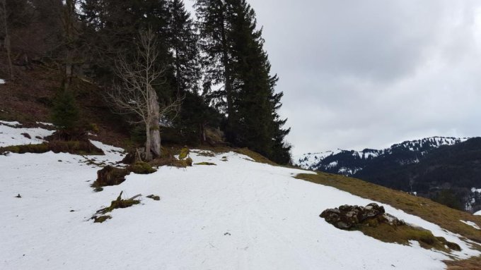 Die Strasse im Wald ging ganz gut zum Laufen. Über die Strasse hat es ein paar alte Lawinenkegel.