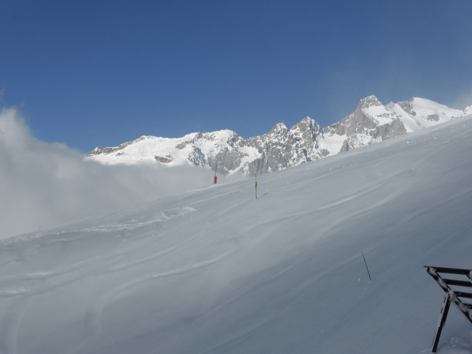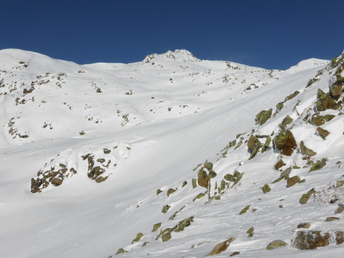 Schnee: sehr viel verfrachteter Neuschnee, Grat teilweise aper, dann wieder Hüfttief, zum Fahren ziehmlich mühsam, wir waren froh als wir die Pisten erreichten