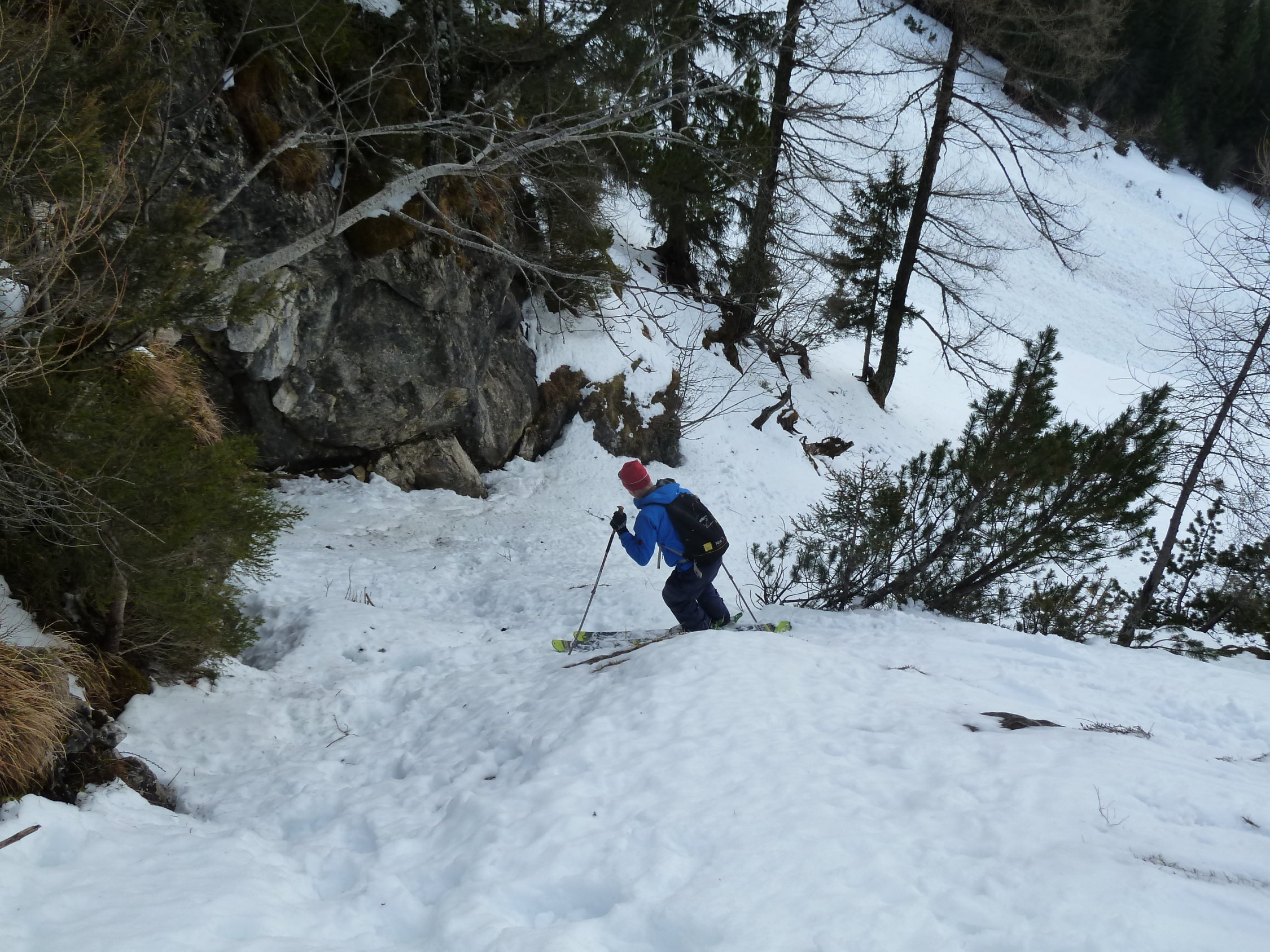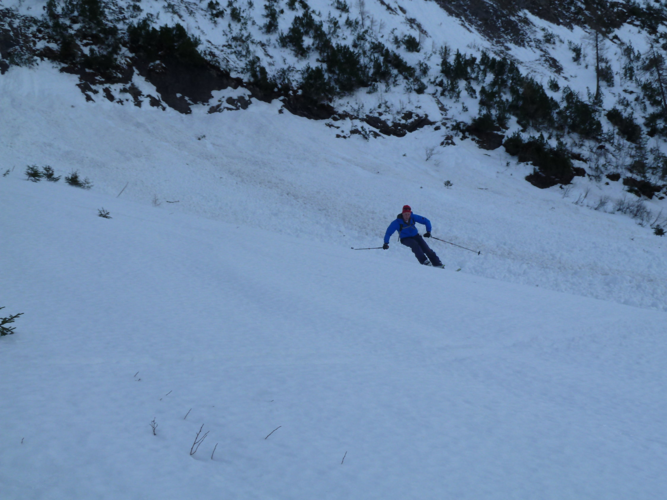 Schnee durchgehend vorhanden (ausser Waldweg zur Alp Topfel), im Wald oberhalb Felscouloir gut tragender Nasschnee, Couloir gut eingeschneit, deshalb nur kurze Tragpassage, oberhalb 2000 m bis Gipfel pickelhart gefrorene Unterlage, Harsteisen waren von Vorteil, Gipfelhang glasig hart und deshalb etwas heikel.
