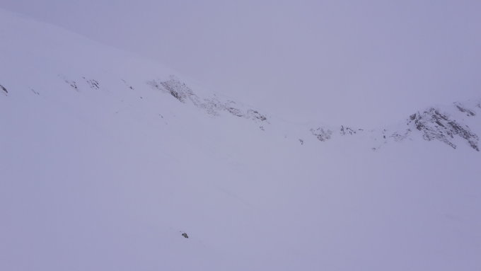Beim Testen der Wächte bei der Einfahrt der N-Flanke ist diese gleich weggebrochen und hat ein Schneebrett ausgelöst. Der Schnee ist bis auf die Altschneedecke durchgerissen. (s. Fotos)