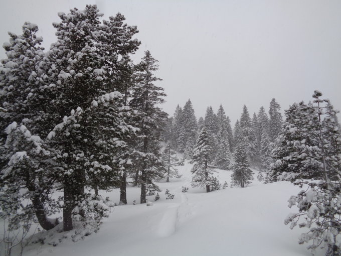 Abfahrt in bestem, ganz leicht schweren Pulver.