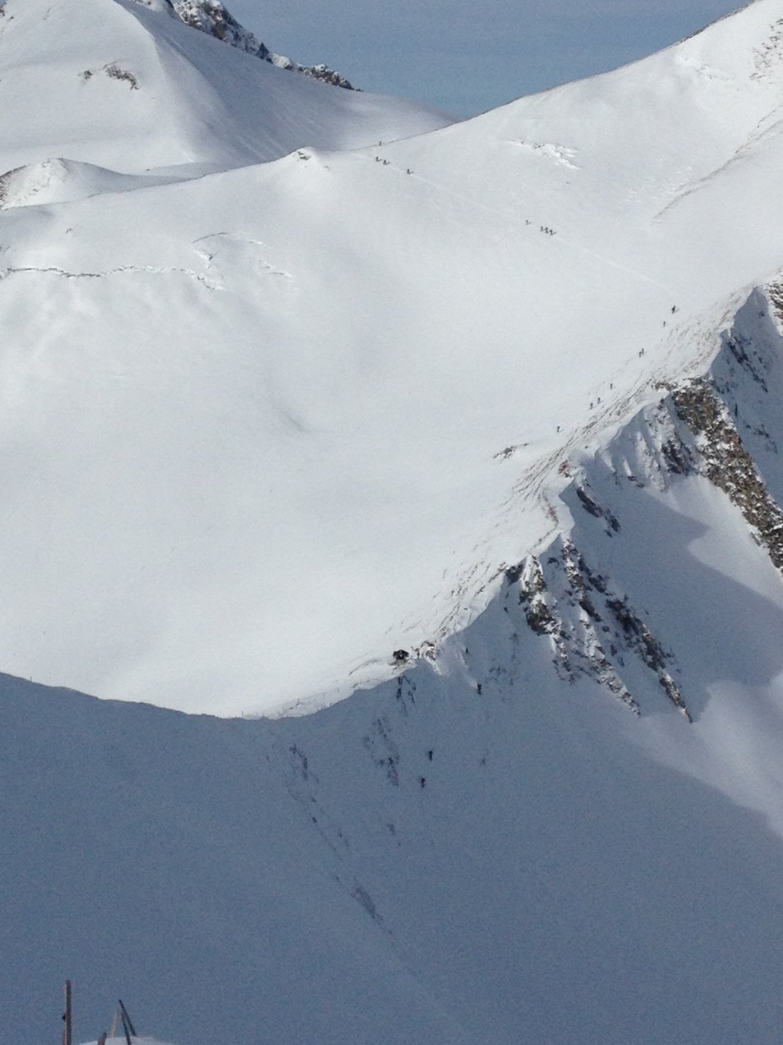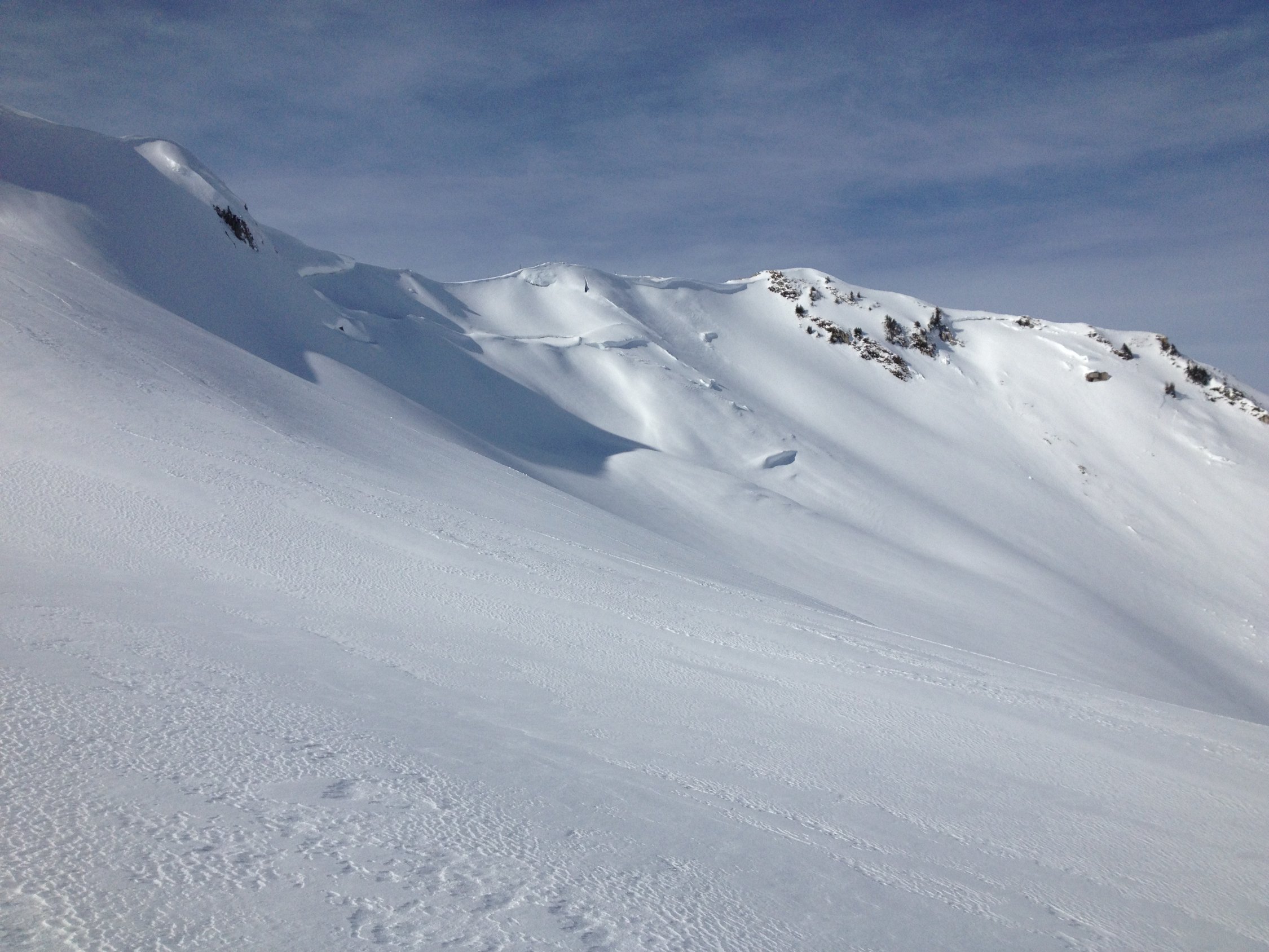 Vom Schibespitzgrat gleitet der Schnee in den Chessel mit kleinen Fischmäulern bis auf die Grasnarbe. Vom Schibespitzgipfel, beim Bunker hat sich kürzlich spontan ein Schneebrett gelöst und ist östlich in den Chessel abgegangen, Ablagerung bereits wieder eingeschneit.