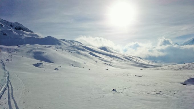 Top Verhältnisse, 20 bis 40 cm Neuschnee. Ab 2400 m bis 2600 m etwas verblasen. Ab Couloir Eva dal Lunghin schöner Pulver bis auf den Gipfel. Abfahrt fast perfekt, wären da nicht doch noch einige Steine. Wir waren heute die einzigen auf dem Piz dal Sasc. Auf den Roccabella ca. 35 Tourengänger!