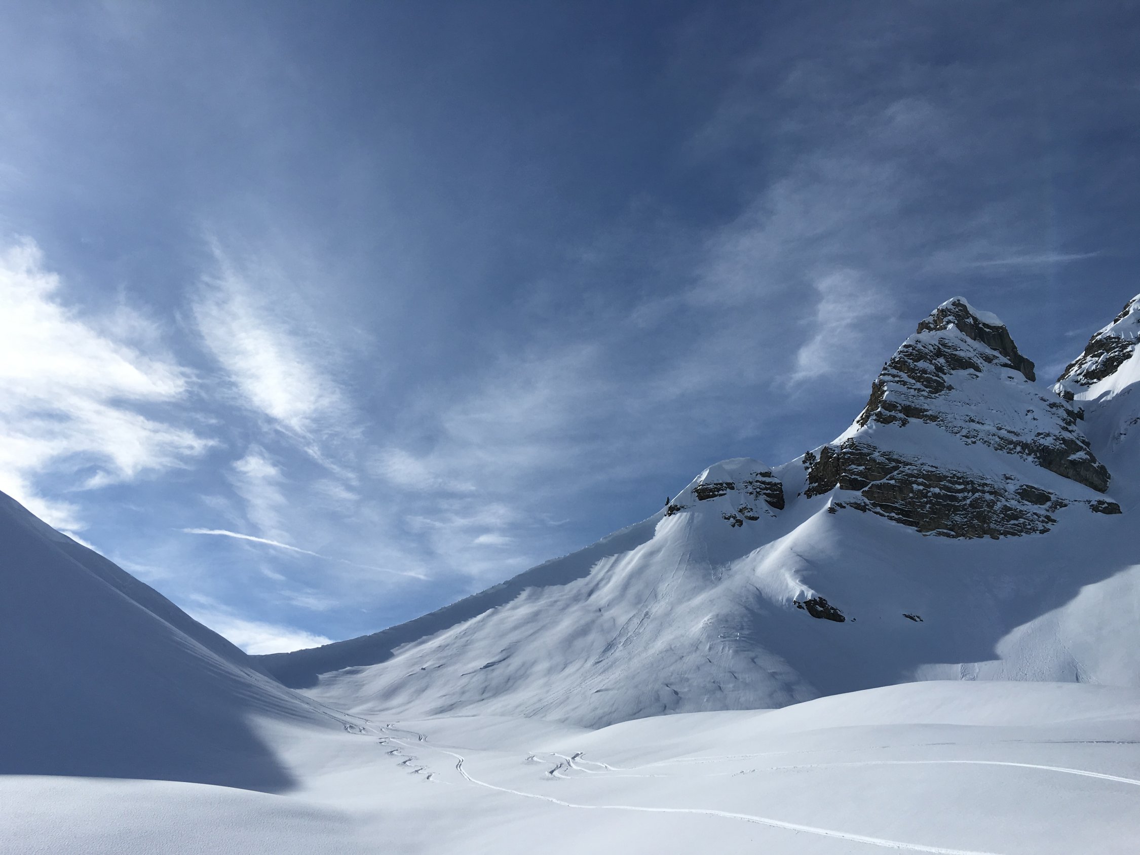 Sehr gute Aufstiegsspur. Bis Grimmigurggi windstill, bis zum Gipfel etwas zügig aber nicht so kalt. Die Abfahrt war perfekt. Oben leicht "gedecktelt", grösstenteils Pulver vom feinsten, unten sulzig. In der Nordflanke kleiner alter Lawinenkegel. Zwei Boarder im unteren Teil in die Flanke gefahren, die Schneedecke war stabil.