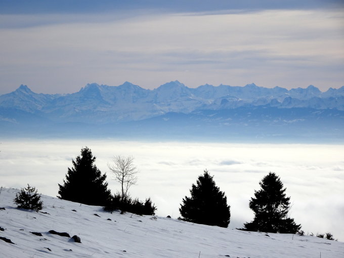 Nach Studium des Wetter- und Schneeberichts verschob ich meine erste Skitour dieses Winters auf später und entschied mich für eine bei Föhn sichere Schneeschuh-Tour. Nicht übermässig lang, wenig Höhenunterschiede und landschaftlich äusserst lohnend. Das rechte Auge kann sich an die Alpen vom Montblanc bis zu den Berner erfreuen, während das linke Auge sich bei den schön bewaldeten Jurahöhen erholen kann. Heute konnte man einen schönen Hochnebelmeer bestaunen, nur das Licht war durch die Föhnschleier leicht bläulich/milchig mit einem leichten gelben Unterton vermischt. Zum Schauen sehr schön, zum Fotografieren eher weniger. Der Wind aus Westen war zuerst mässig, dann, vorallem auf dem Grat, recht stark. Mit diesem guten Rückenwind konnte man ganz zügig laufen, es war als hätte man das Motor eines E-velo in den Beinen (ziemlich übertrieben). Die erstaunlich vielen Schneeschuhläufer die entgegenkamen und der Wind von Vorne hatten, sahen die Lage bestimmt anders.