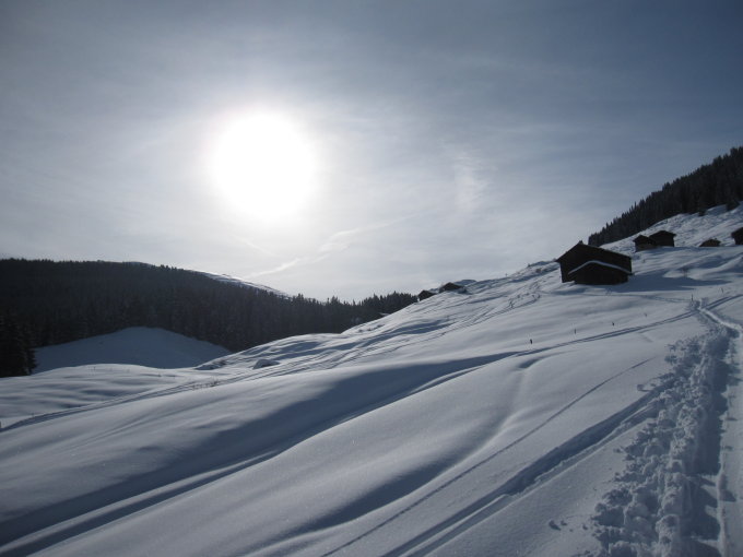 Sehr gute Verhältnisse. Meist Pulverschnee,unten etwas schwer. Nach dem Abfahrt-Einstieghang teilweise tragender Deckel, verziert mit leichtem Pulverschnee. Überraschenderweise fast keine anderen Leute im Gebiet unterwegs.