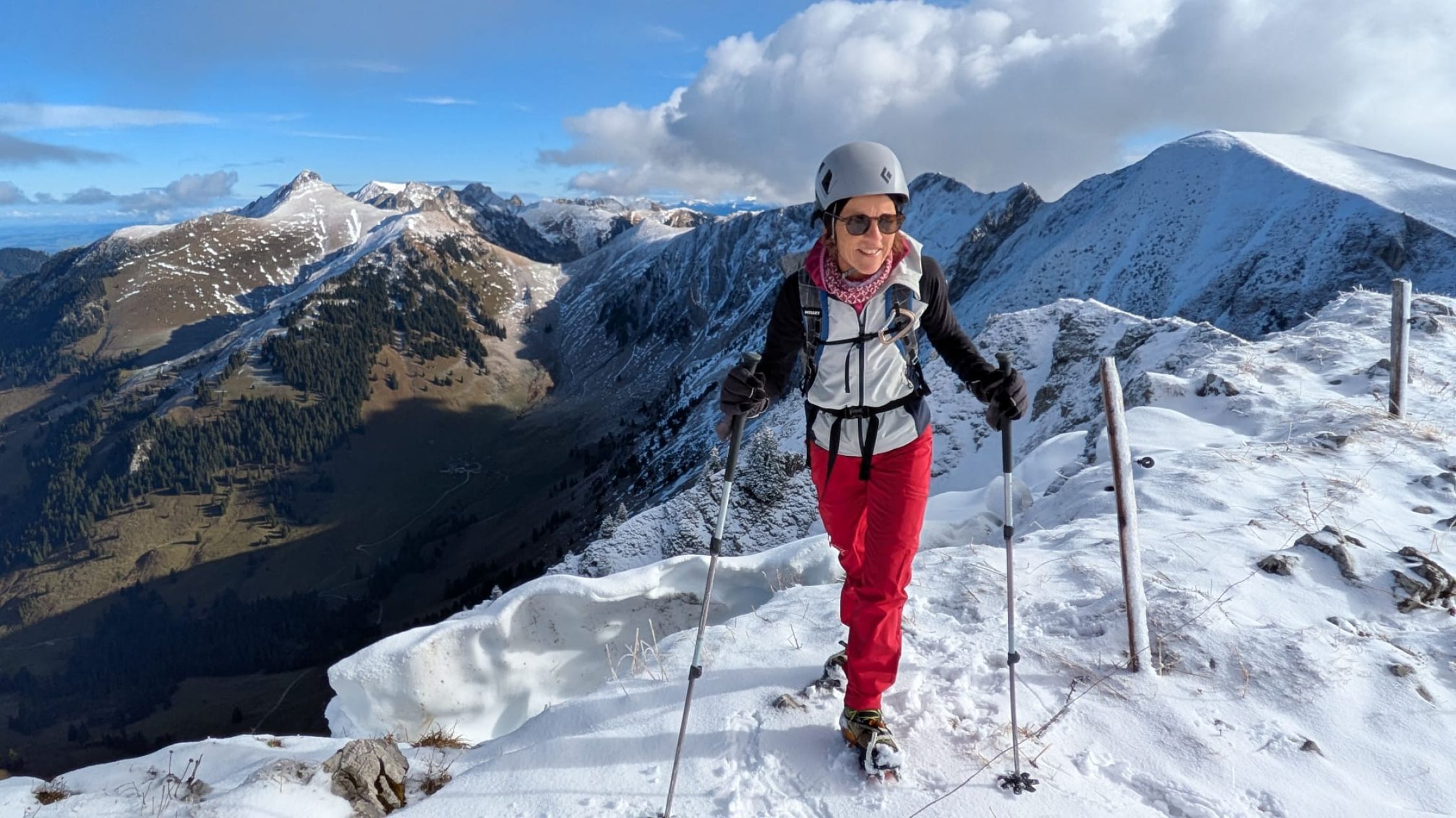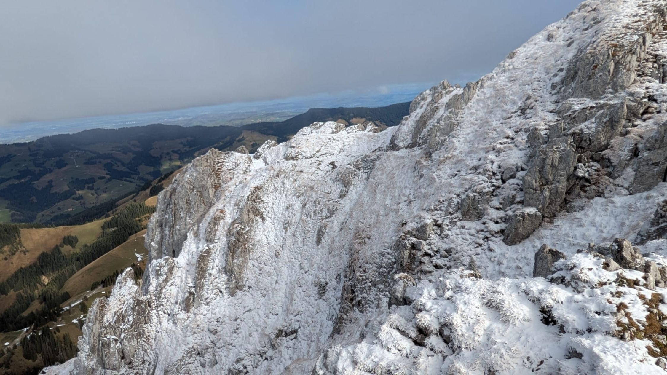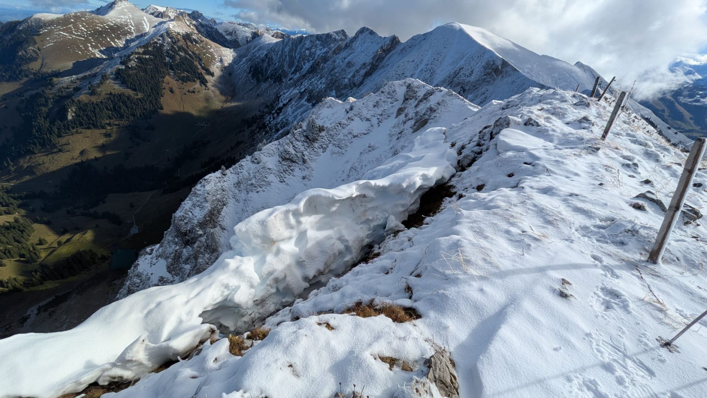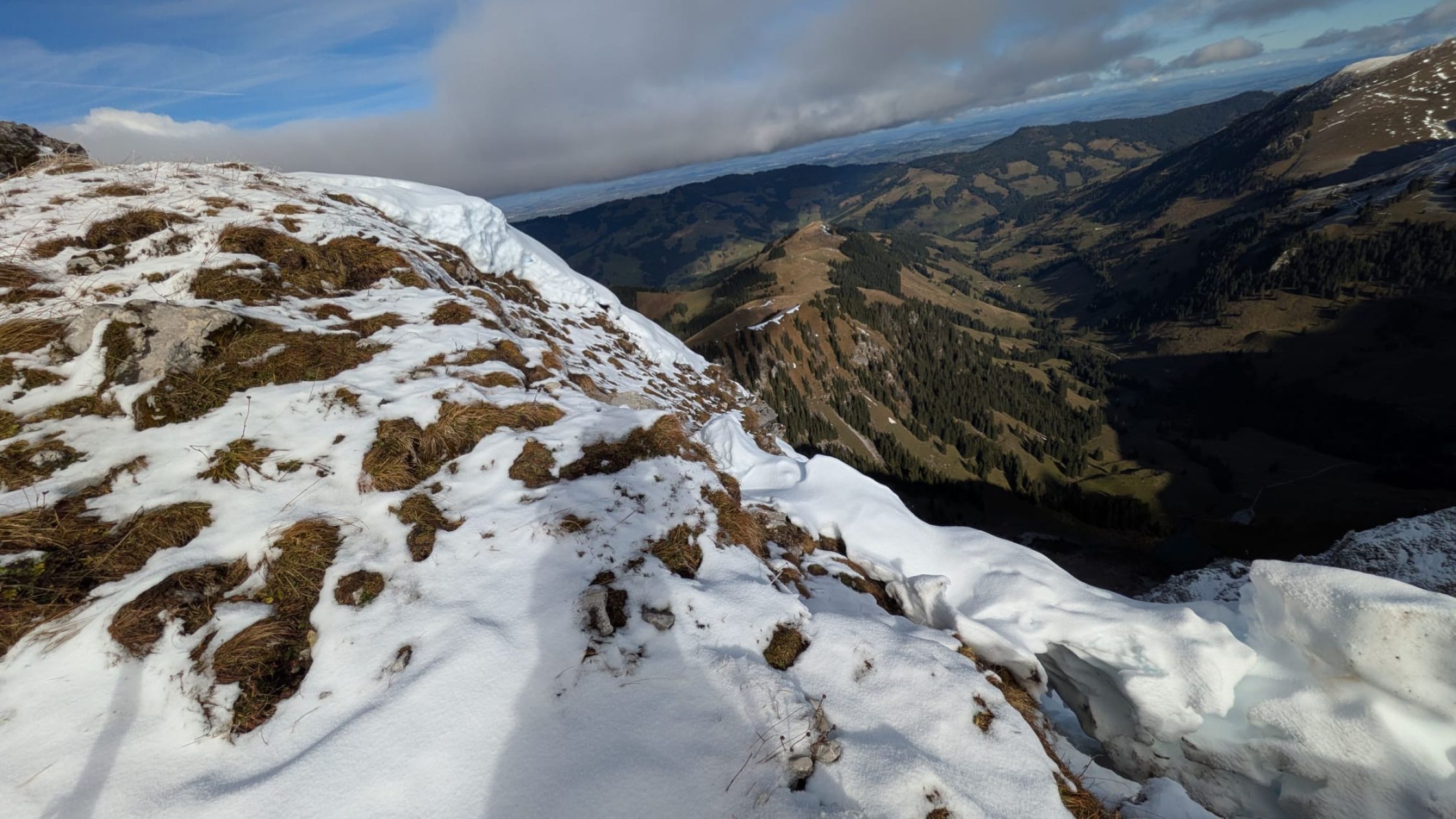 Nach der Besteigung über die Nordflanke der Schibe sind Nicole und ich über den Westgrat auf den Hahnen 2034m ab gestiegen, und in den namenlosen Sattel gelangt. Von hier über den Ostgrat auf die Märe. Diese drei schönen Berge kann man zu einer grossartigen Ueberschreitung zusammen hängen. Das Panorama reicht vom Mont Blanc, zum Matterhorn, den drei Grossen, bis zum Titlis im Osten. Diese Voralpen Berge bieten grandiose Blicke zu den Hochalpen.
