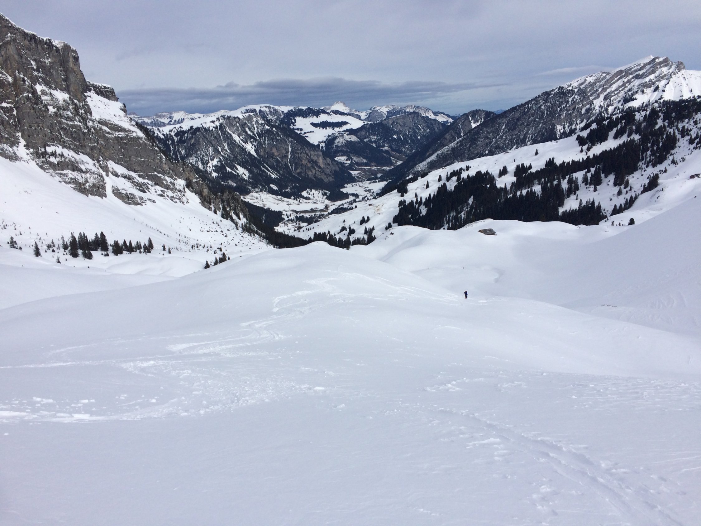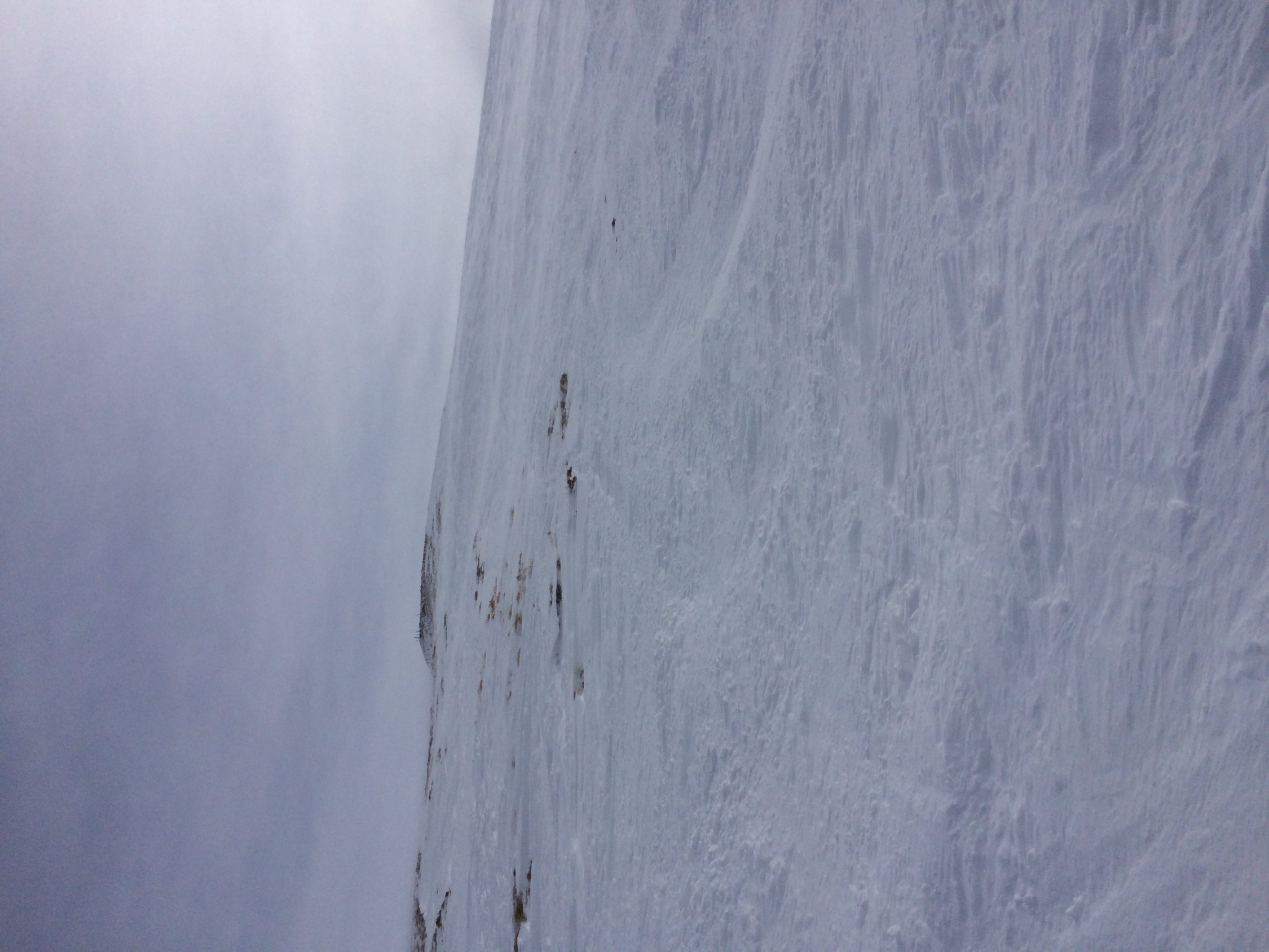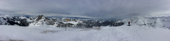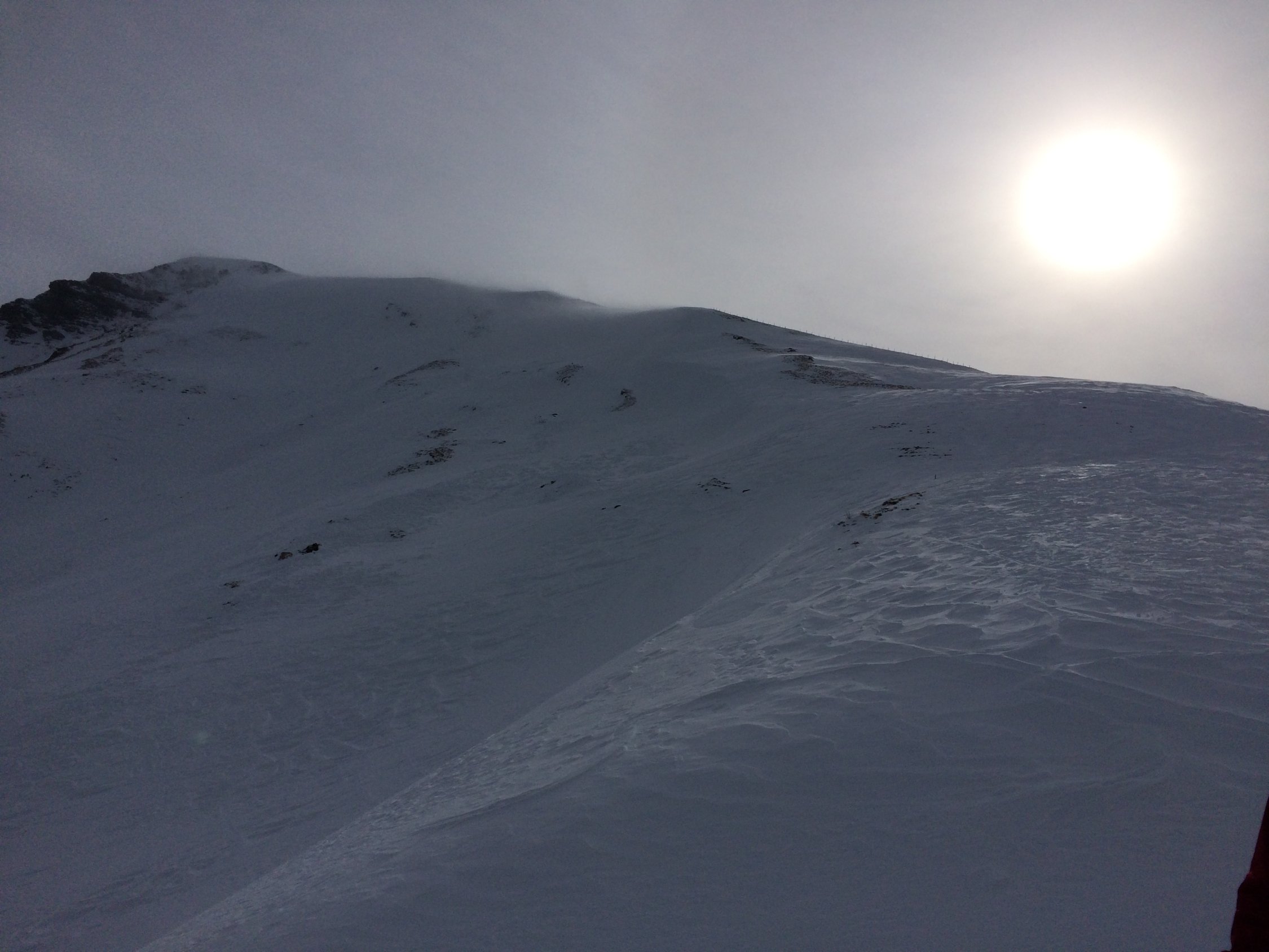 Durchwegs Schnee. Bis ca 1700 pappig bzw feucht, ab da pulvrig und ab 2000 (grimmifurrgi) abgeblasen somit hart. Ab grimmifurrgi starker bis stürmischer Wind. Nahm ab 11 Uhr an Stärke zu. Grosse Schneeverfrachtungen.