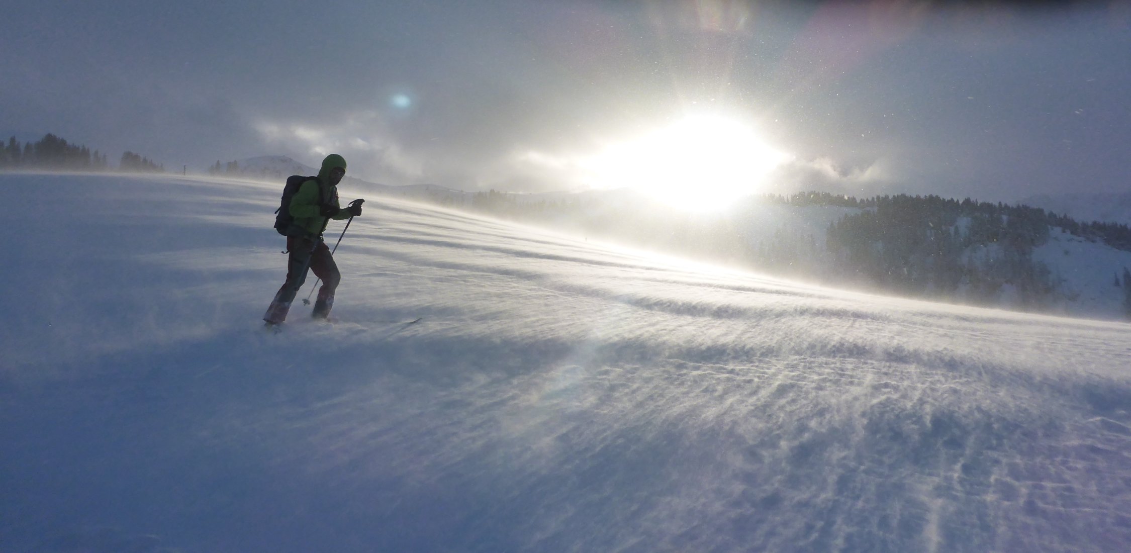 Gestartet im Schneesturm um 15:00 Nachmittags. Ganz oben ist der frische Schnee schon sehr heftig windbearbeitet, auf den anschliessenden 600 Höhenmetern Abfahrt mehr oder weniger bester Powder.