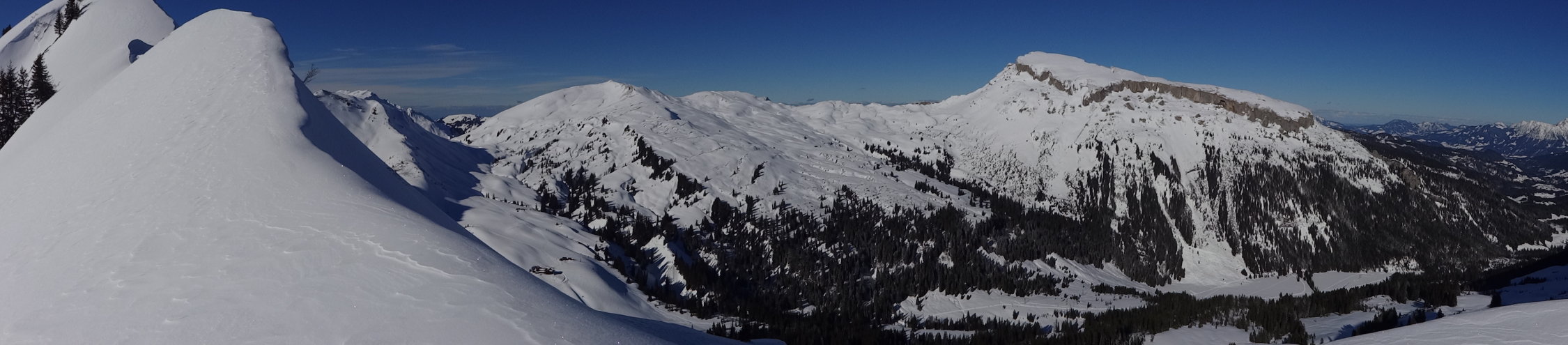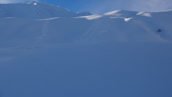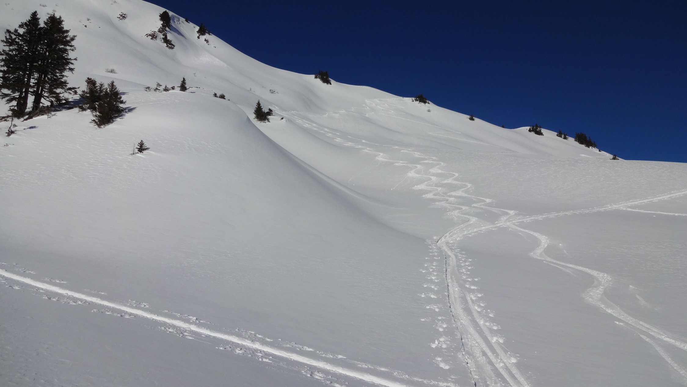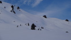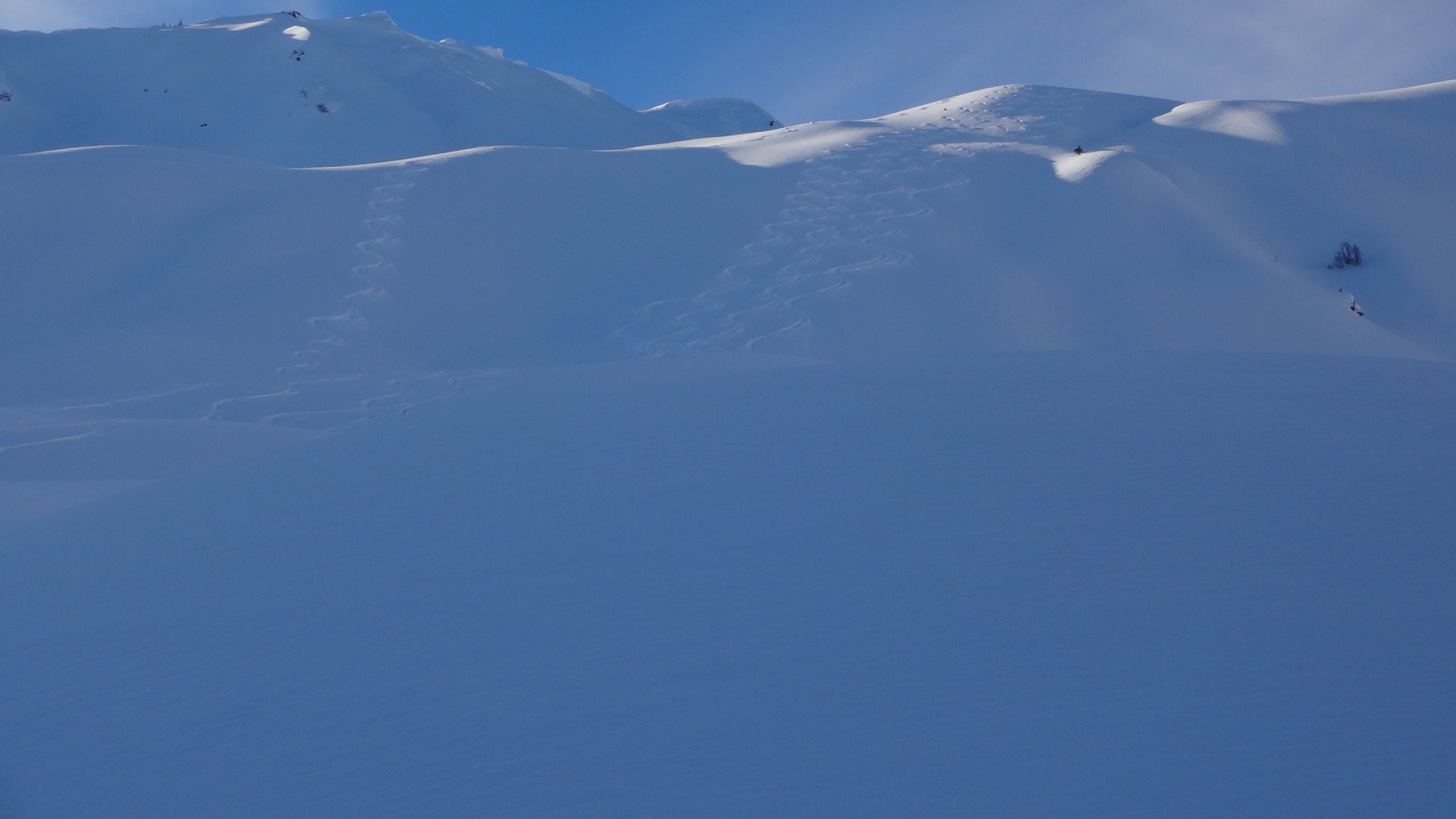 Da wo heute in dieser Höhe viel senkrechte Sonne war, könnte statt Pulver Harsch anzutreffen sein. Ansonsten genug und guter Schnee.