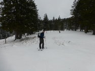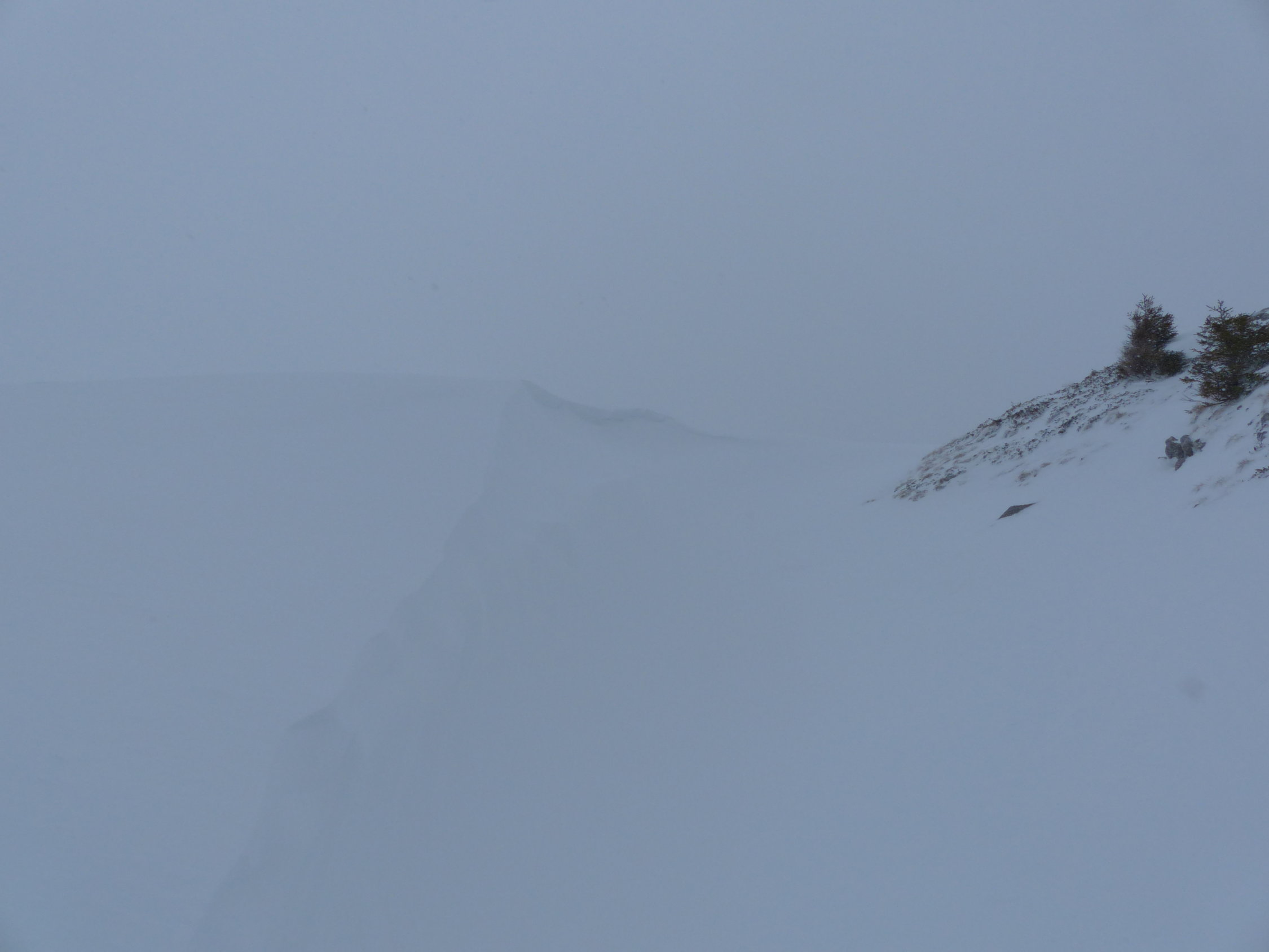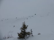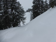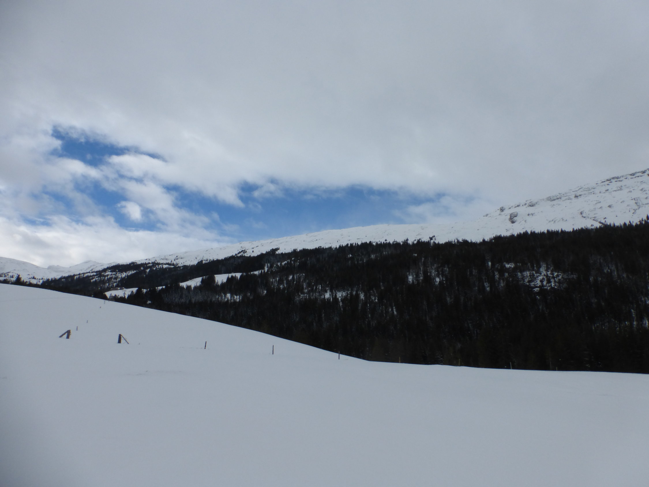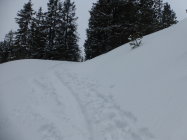 Im oberen Teil der Abfahrt pulvrig, teilweise gemischt mit windgepresstem Schnee, aber noch gut fahrbar. Im Wald pulvrig mit Tendenz zu schwerem Pulver.