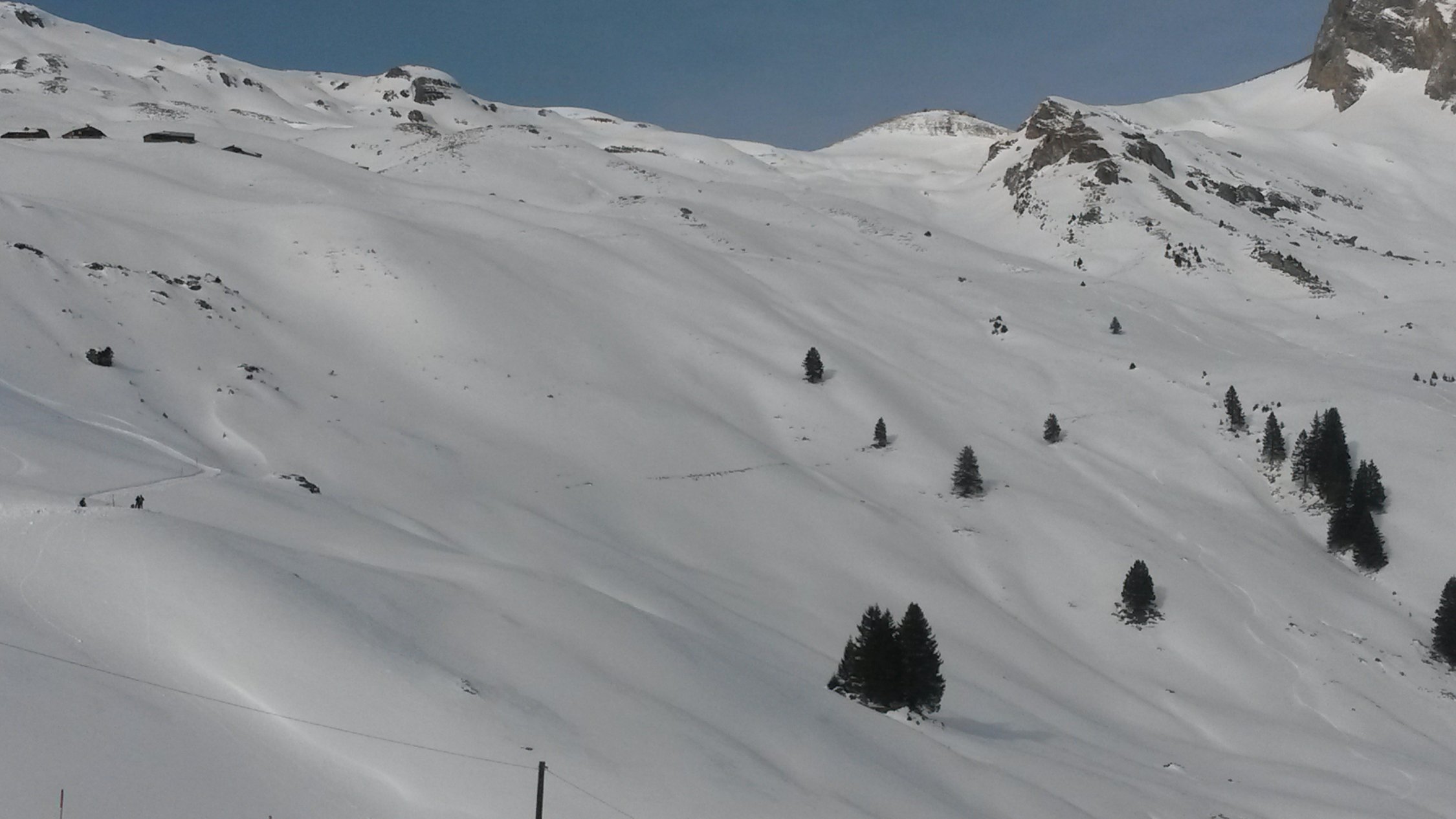 Die Rücken waren leicht abgeblasen und hatten eine leichte Eiskruste von den Vortagen, war aber nicht sonderlich störend. Ansonsten hatte es feinsten Pulverschnee bis zur Bussalp. Ab da war die Abfahrt noch bis zum Schlittenbeizli "Weidli" möglich, ab da ist definitiv Schluss. Auf den Waldwegen vor dem Beizli Ski's unbedingt abziehen, Steinkontakt.